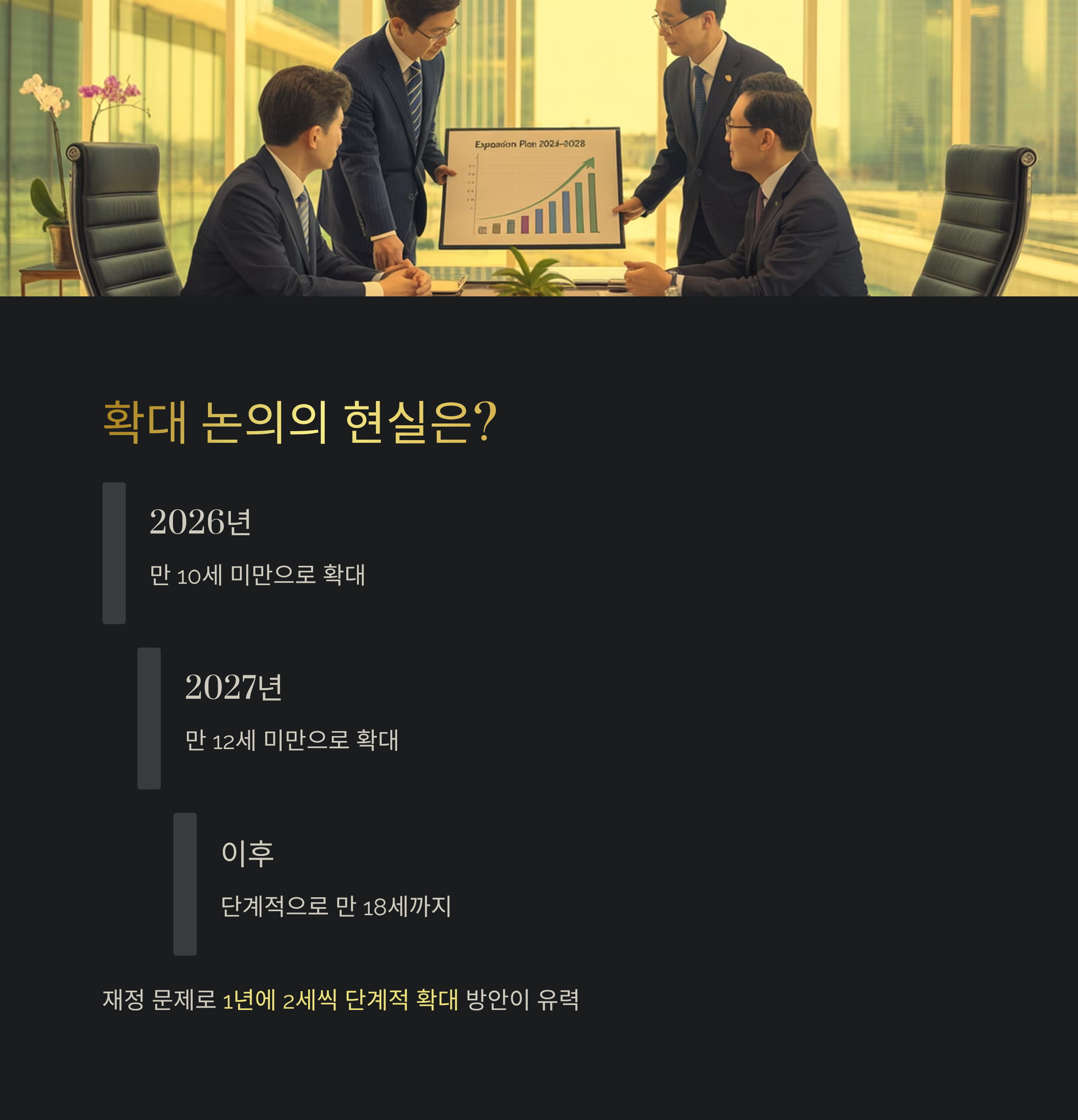 하지만 현실적인 재정 문제로 1년에 2세씩 단계적으로 확대하는 안이 유력하며, 실제 시행되면 2026년엔 만 10세 미만, 2027년엔 만 12세 미만으로 확대될 수 있다는 시나리오가 나오고 있어요.
