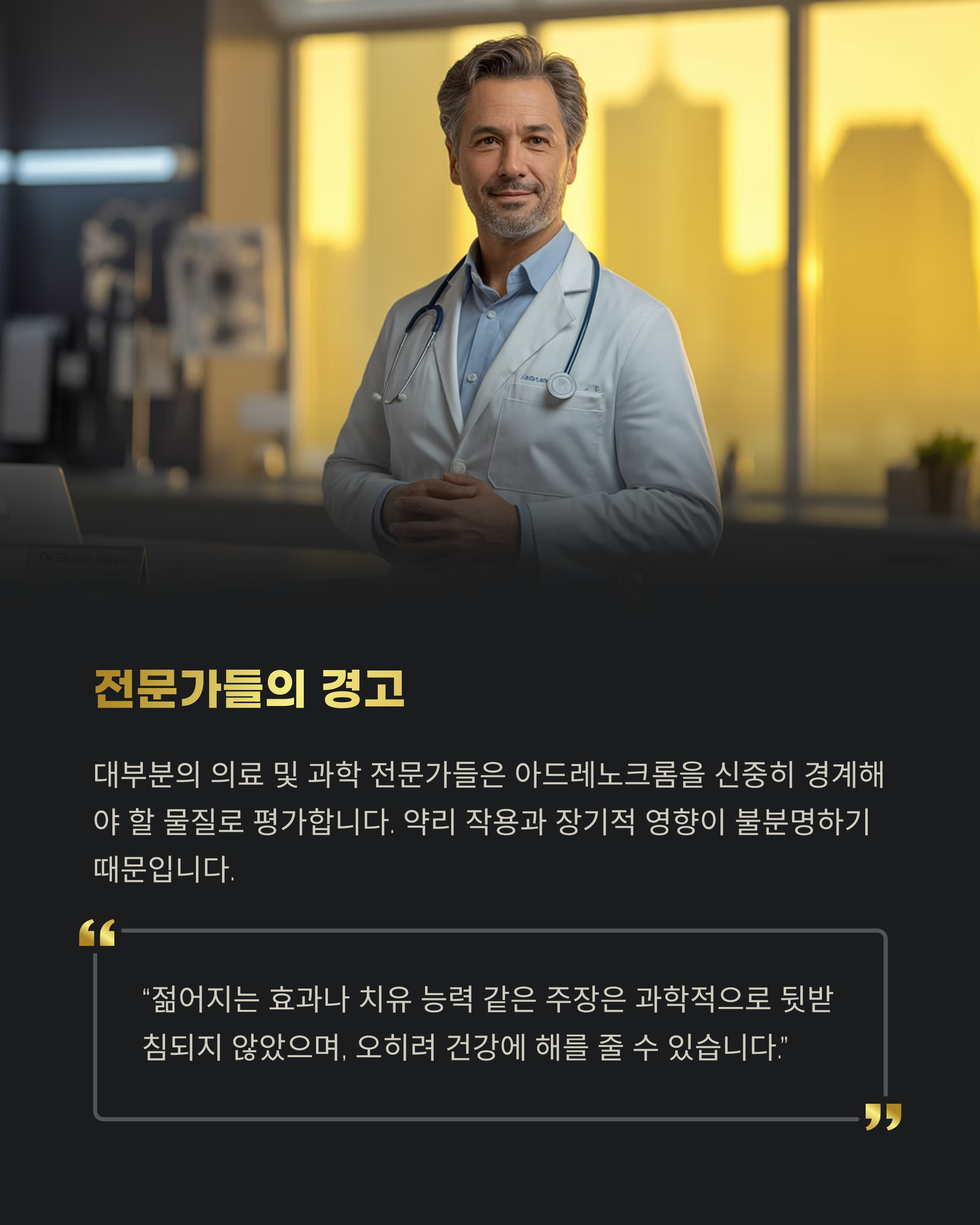 대다수 의료 및 과학 전문가들은 아드레노크롬을 신중히 경계해야 할 물질로 평가합니다. 약리 작용이 불분명하고, 장기적 영향 역시 알려지지 않았기 때문입니다.