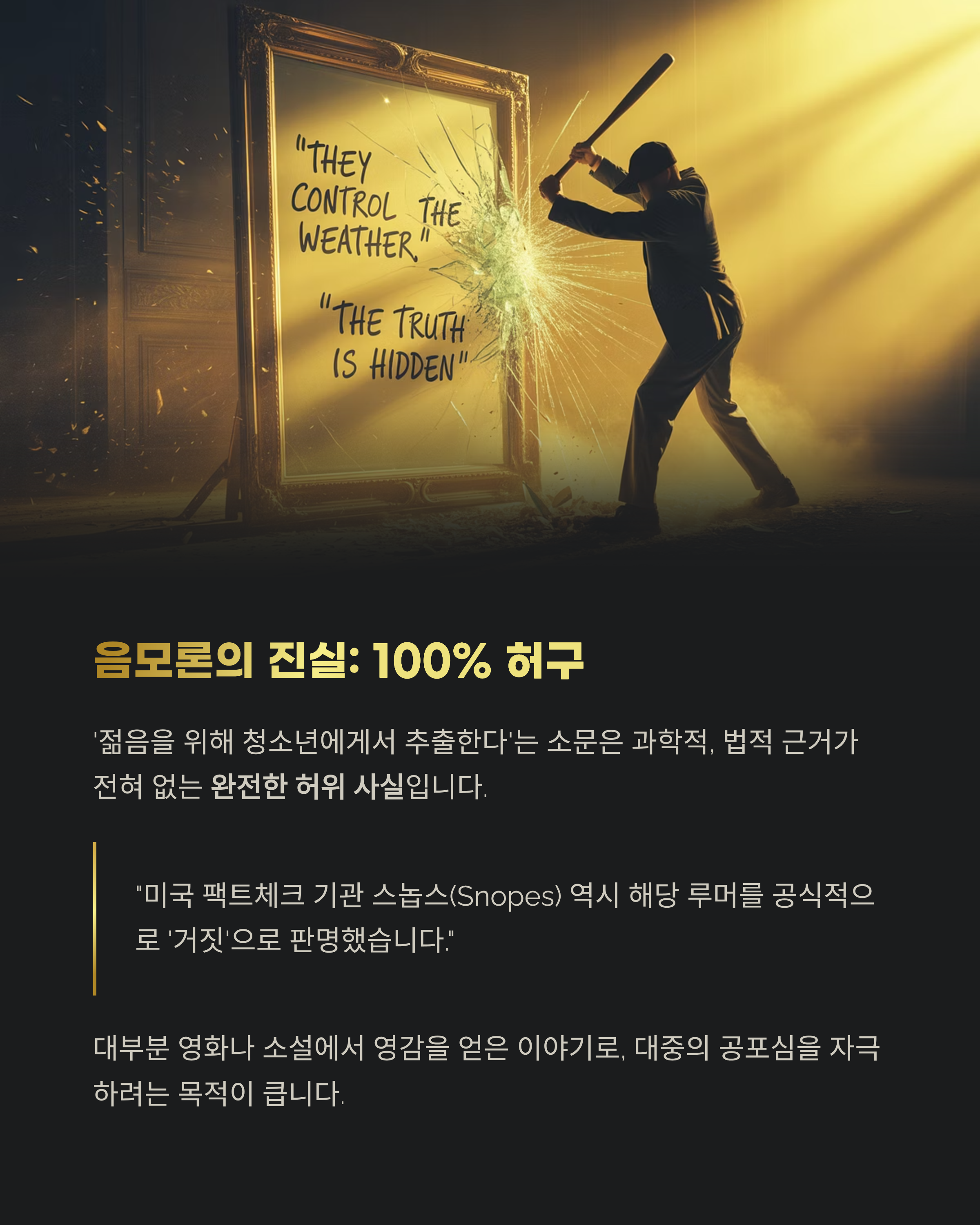 가장 많이 퍼져 있는 소문 중 하나는 ‘청소년에게서 추출해 젊음을 유지한다’는 이야기입니다. 이는 완전히 허위이며, 과학적·법적 근거가 전혀 없습니다. 미국 팩트체크 기관 스놉스(Snopes)도 이 루머를 공식적으로 거짓으로 밝혔습니다.