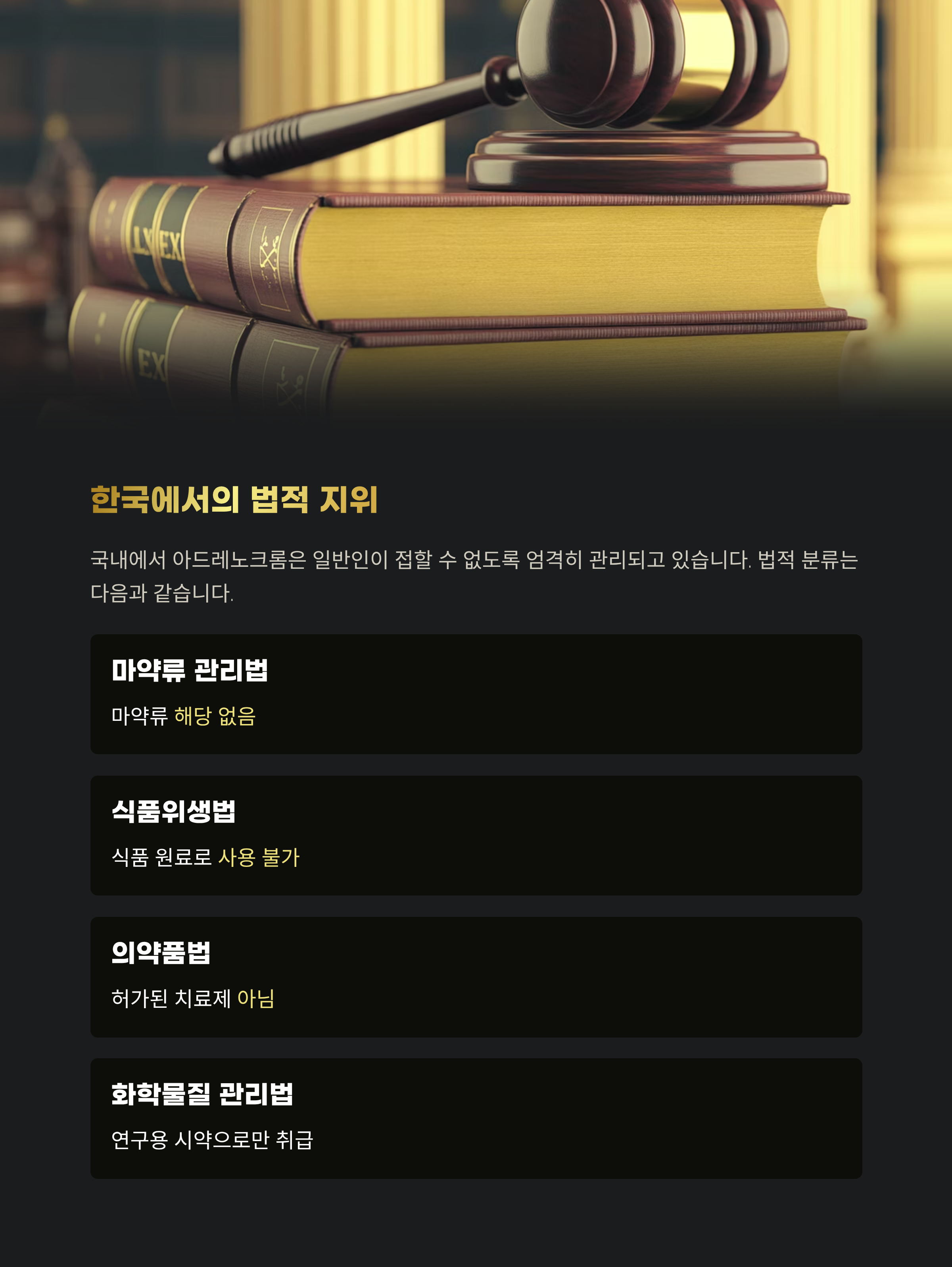 국내에서 아드레노크롬은 법적으로 다음과 같이 분류되고 있습니다.
