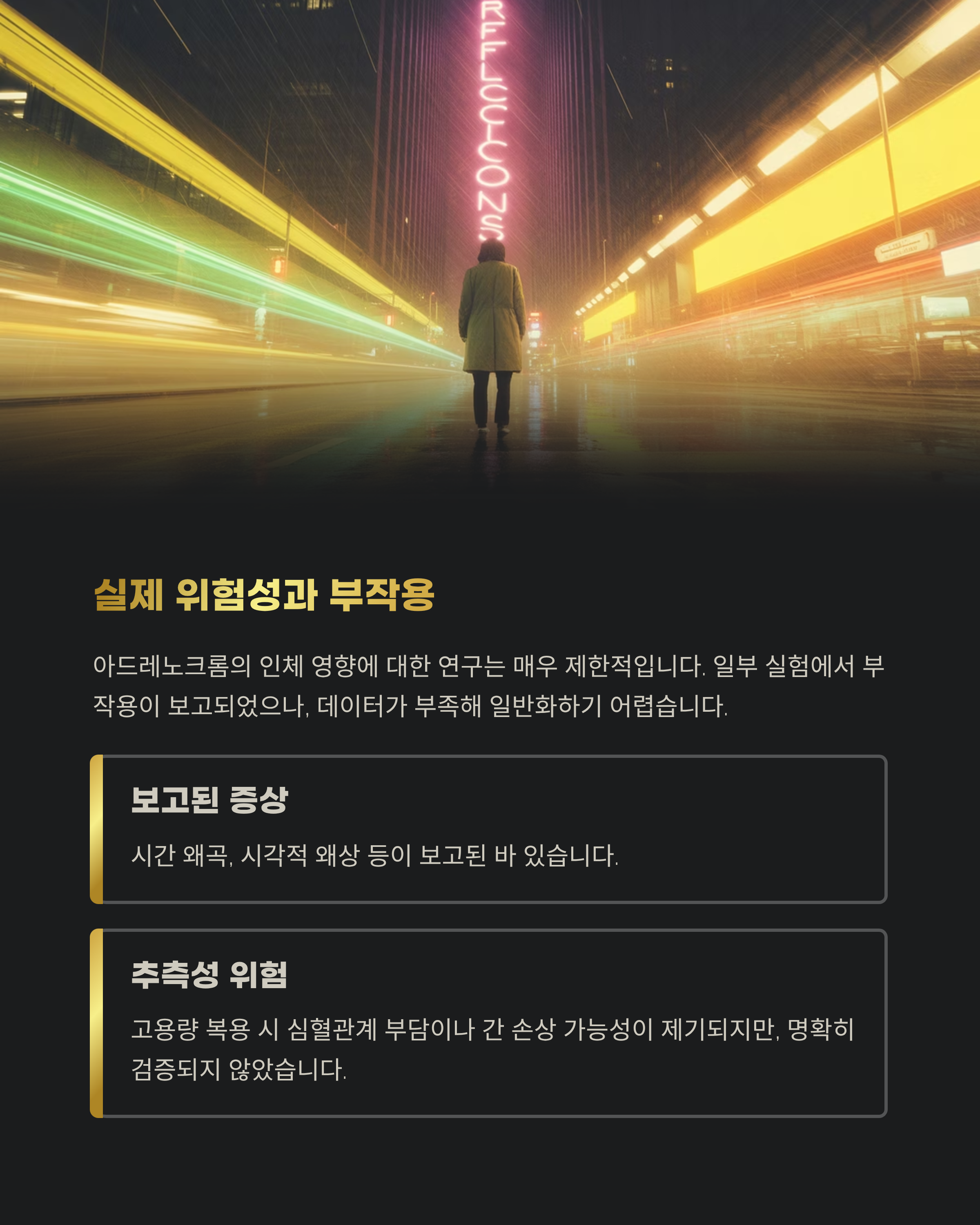 아드레노크롬이 인체에 어떤 영향을 미치는지에 대한 연구는 매우 제한적입니다. 일부 실험에서는 시간 왜곡, 시각적 왜상 등이 보고되었으나, 일반화하기엔 데이터가 부족하죠.