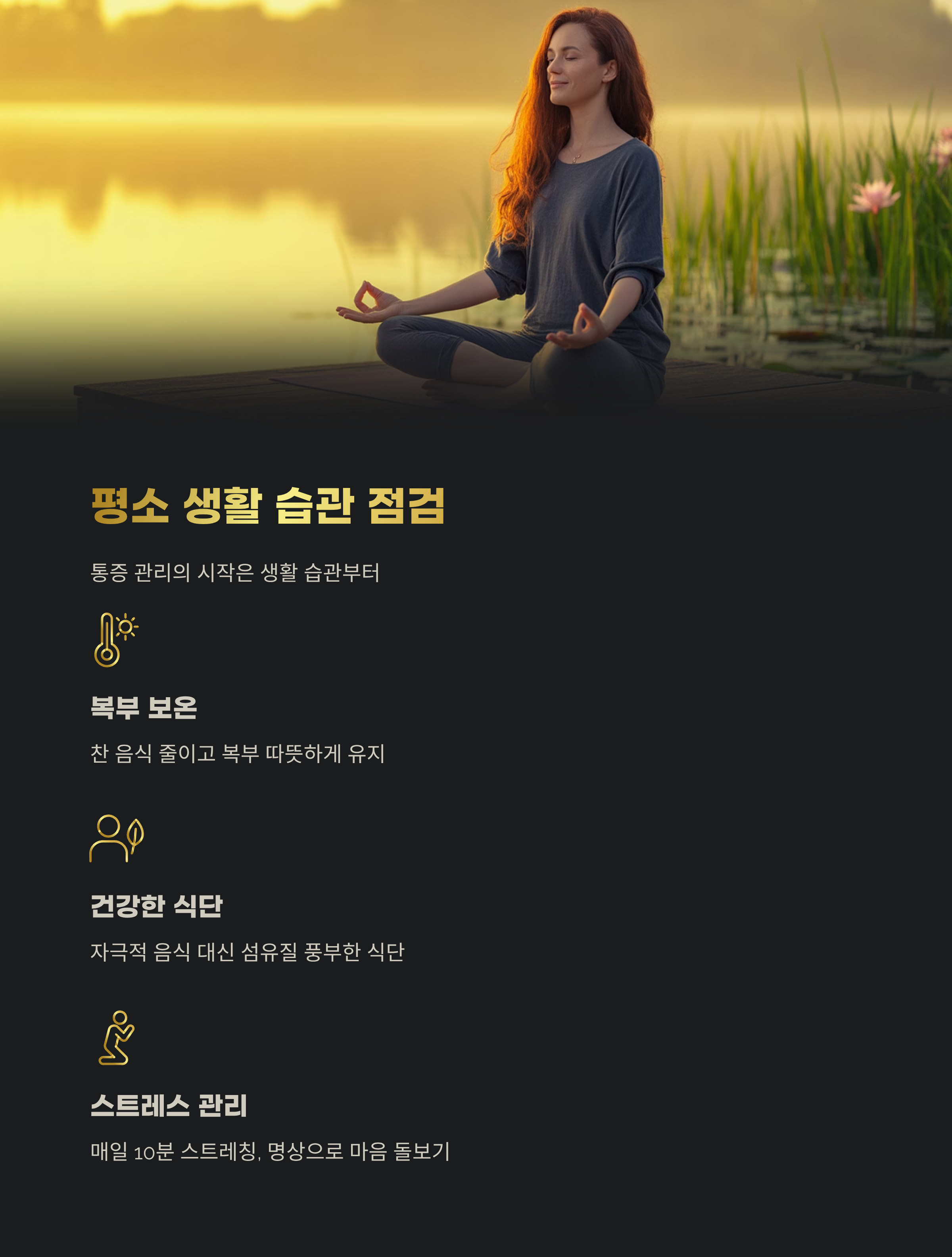 스트레스 관리도 빼놓을 수 없어요. 긴장과 불안은 자율신경에 영향을 줘서 복통을 유발할 수 있답니다. 매일 10분만이라도 가벼운 스트레칭이나 명상으로 마음을 돌보는 시간을 가져보세요.