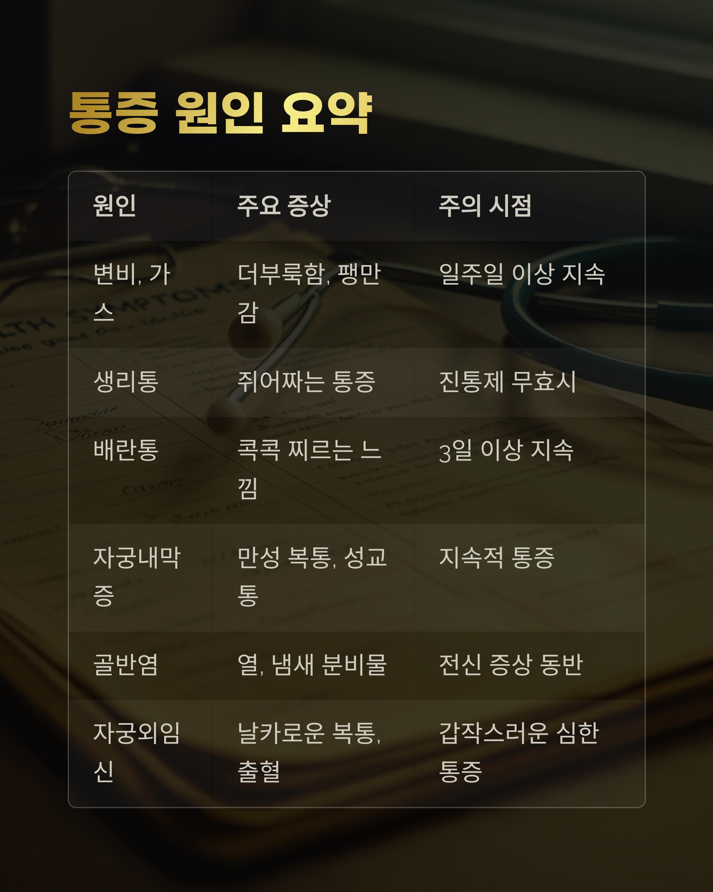 | 생리통 | 쥐어짜는 통증, 허리/골반 통증 | 진통제로도 호전되지 않을 때 |