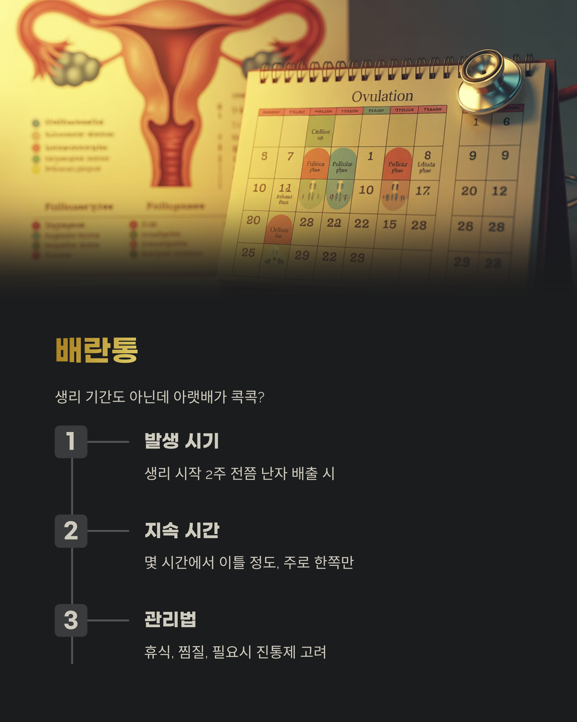 | 배란통 | 콕콕 찌르는 느낌, 짧은 지속 시간 | 3일 이상 지속되거나 통증 심할 때 |