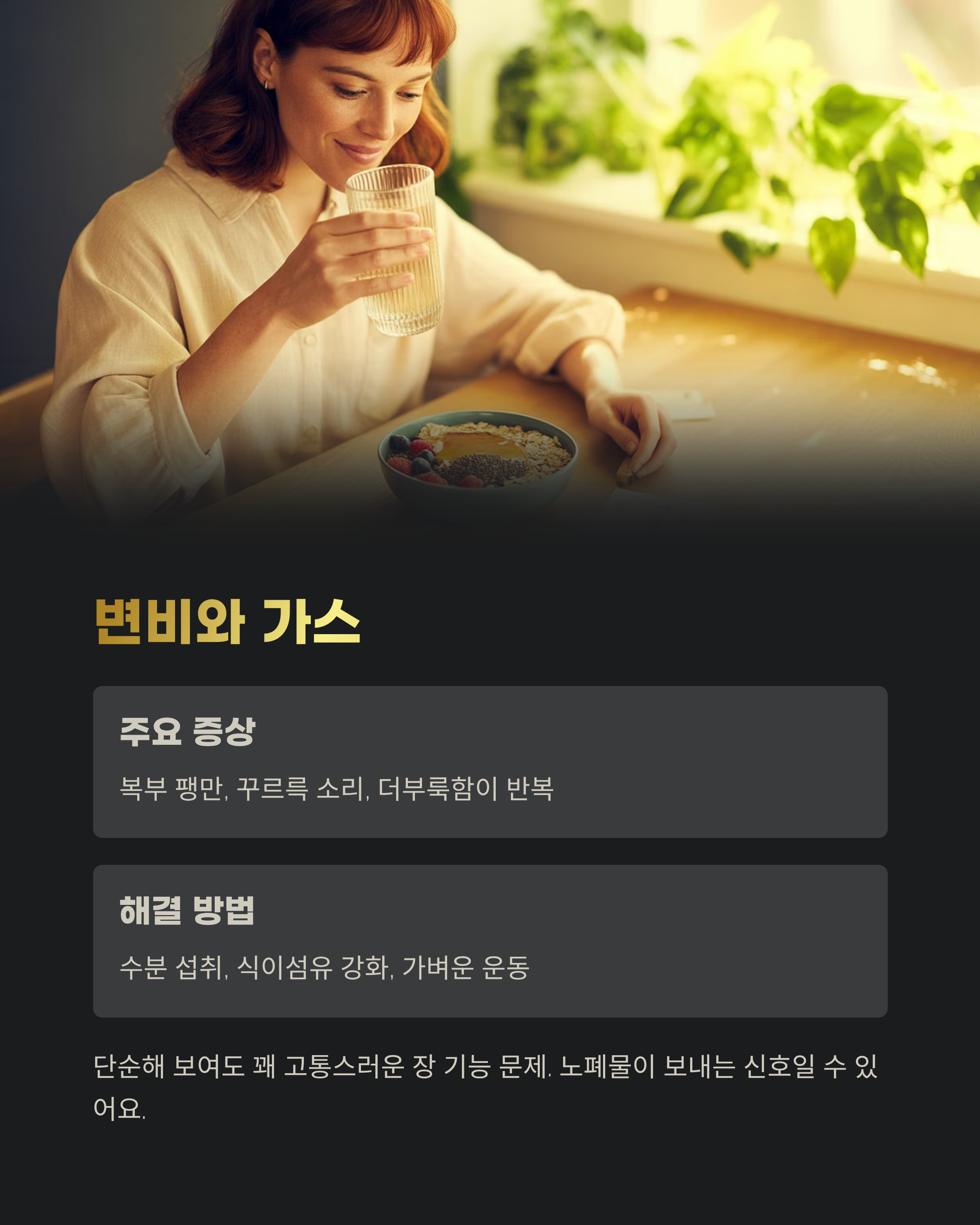 배가 빵빵해지는 느낌, 꾸르륵 소리, 더부룩함이 반복된다면 장 속 노폐물이 신호를 보내는 중일 수 있어요. 이럴 땐 수분 섭취, 식이섬유 강화, 가벼운 운동 등이 효과적이에요.