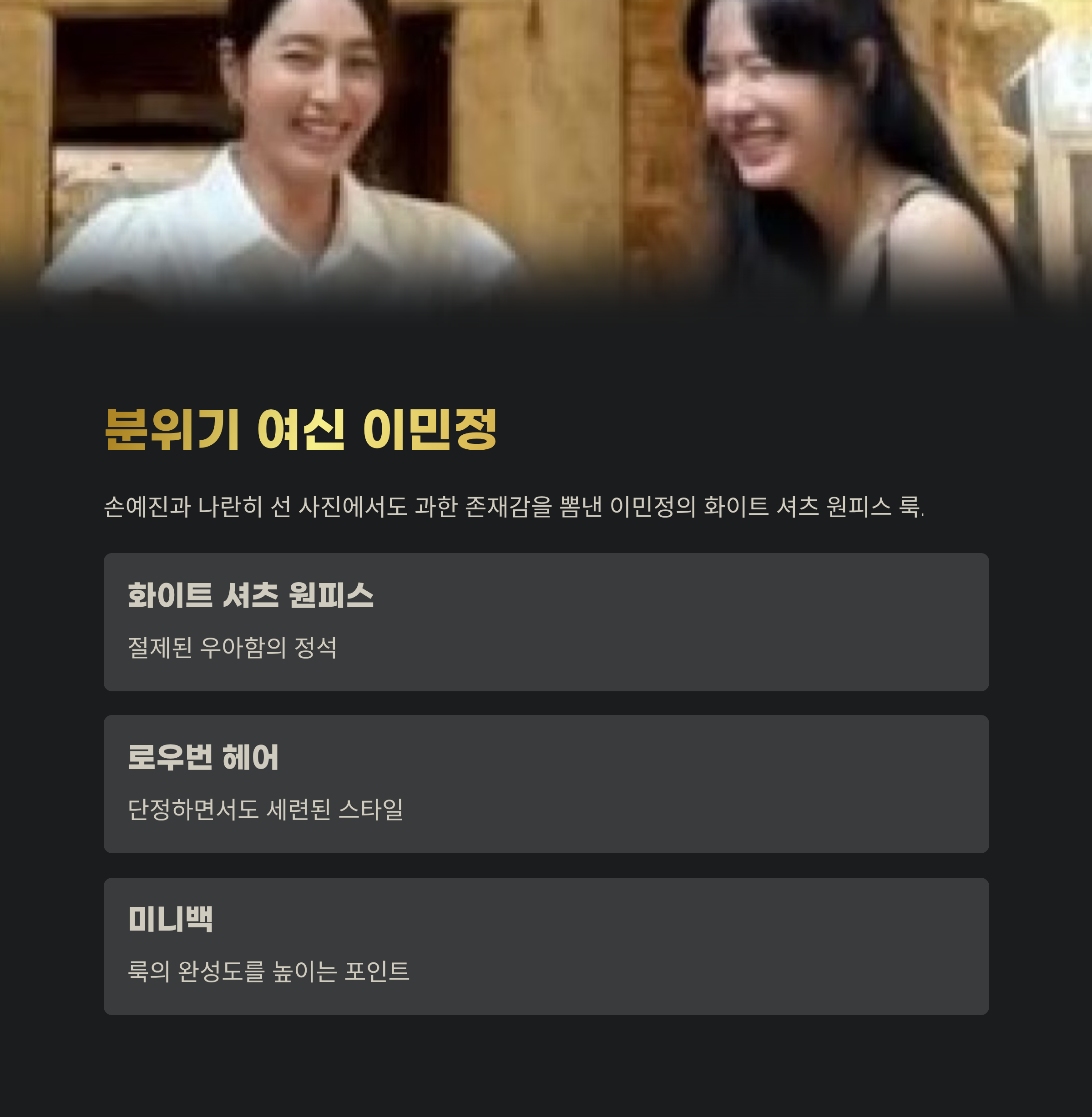 손예진과 나란히 선 사진에서조차도 과한 존재감을 뽐낸 이민정. 화이트 셔츠 원피스와 로우번 헤어, 미니백으로 완성한 룩은 절제된 우아함의 정석이었습니다.
