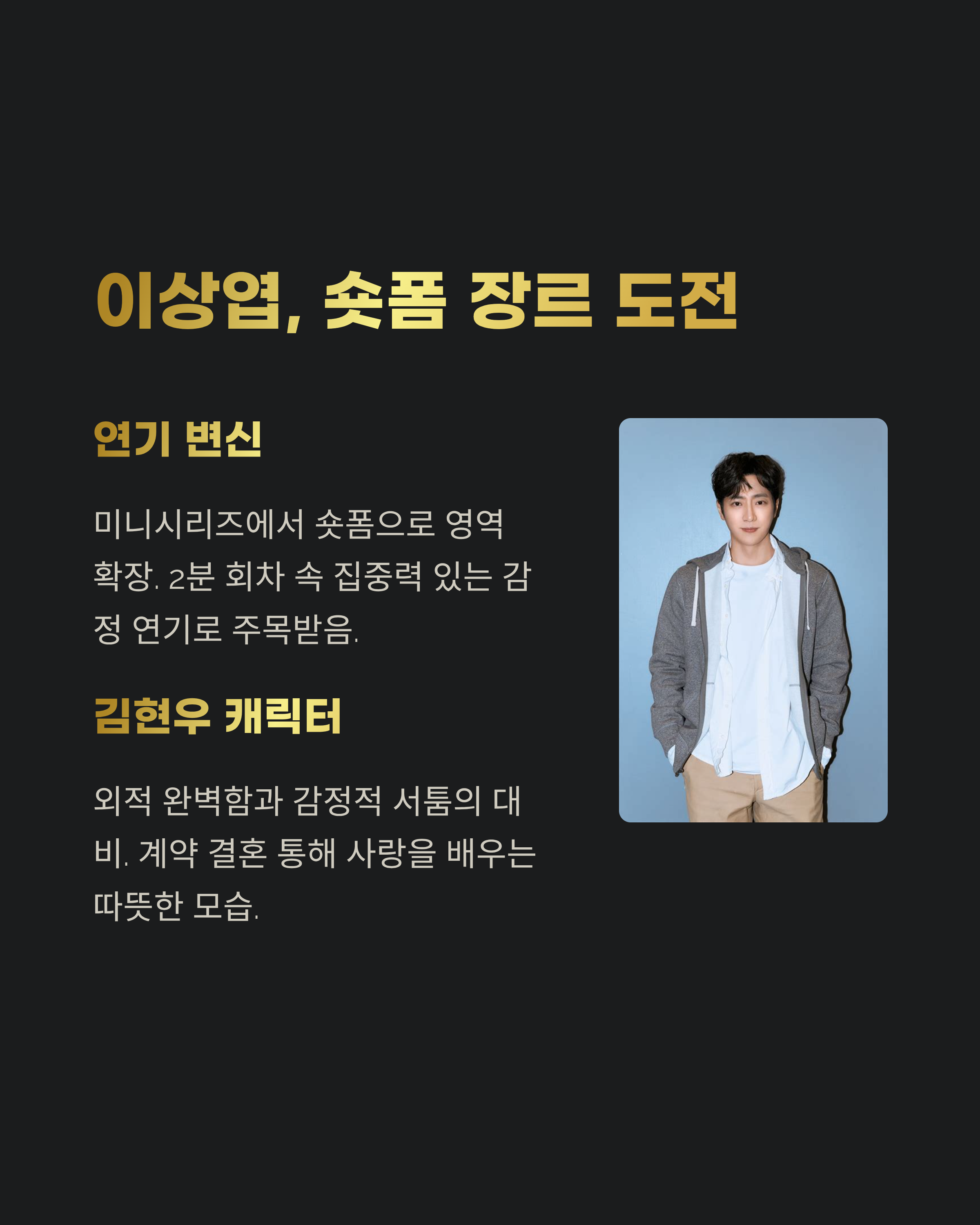 기존 미니시리즈와 정통 드라마에서 꾸준한 연기력을 보여준 이상엽은 이번 작품을 통해 숏폼 장르에 도전했습니다. 그리고 단 2분 남짓한 회차 속에서도 감정을 쌓고 전개를 이끄는 집중력 있는 연기로 주목을 받고 있습니다.