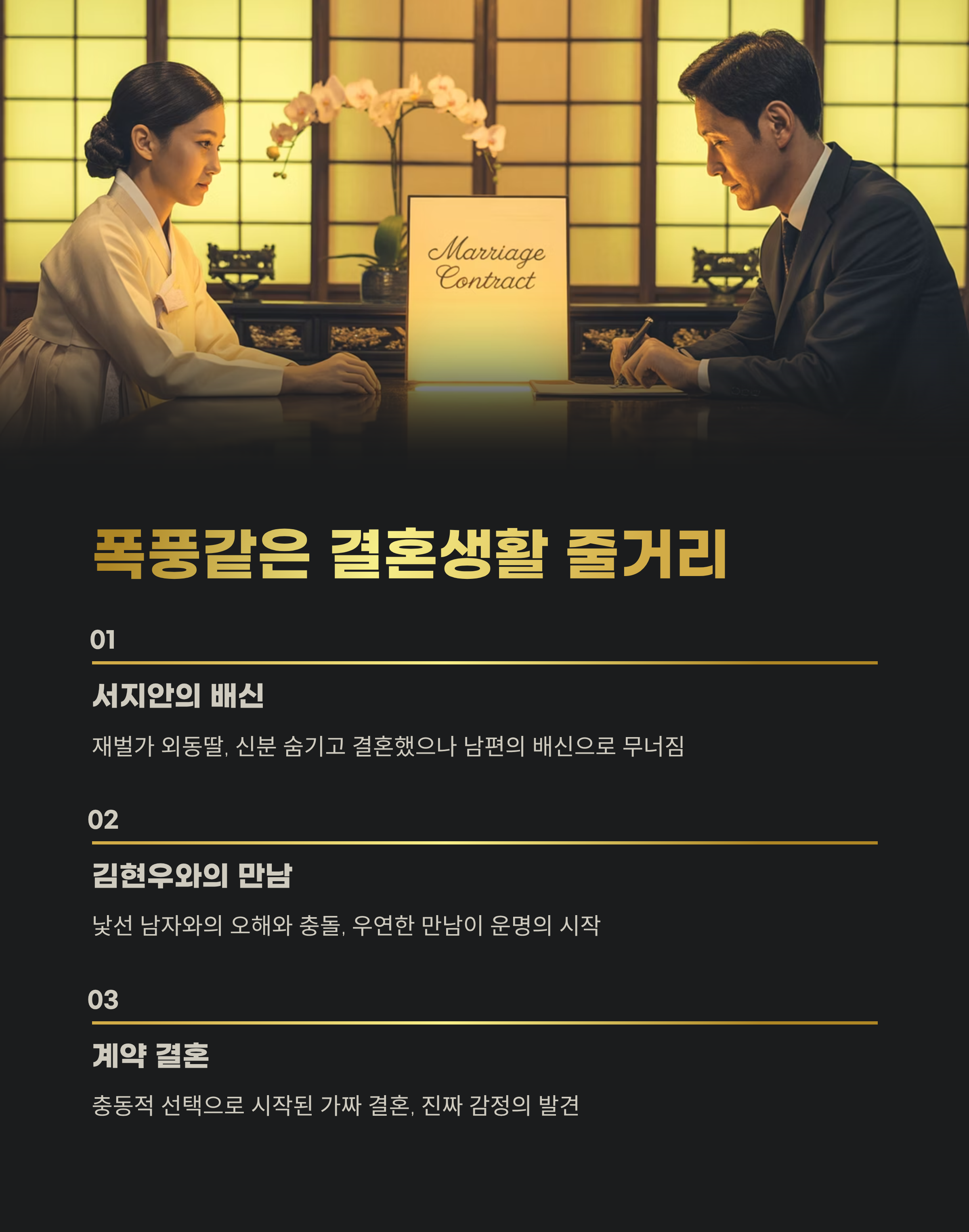 세계 10대 재벌가 외동딸인 서지안(전사라)은 아버지의 억압을 피해 신분을 숨기고 조용한 결혼을 선택하지만, 남편의 배신으로 하루아침에 무너집니다. 이혼 절차가 끝나기도 전에 등장한 낯선 남자, 김현우(이상엽)는 처음부터 그녀를 오해하고, 또 반대로 오해받습니다.