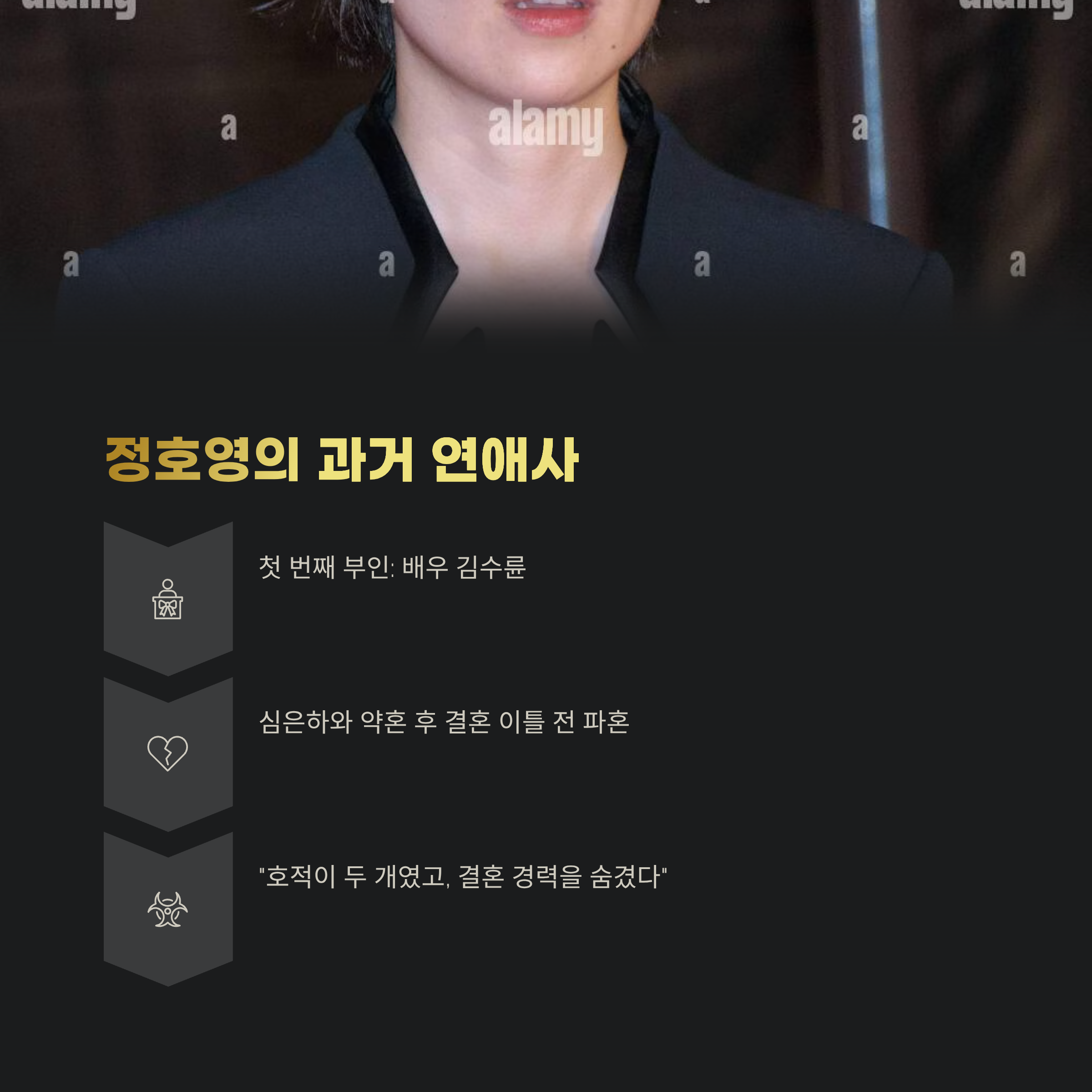 또 다른 놀라운 사실은, 정호영이 한때 톱스타 심은하와 약혼했던 남자라는 점입니다. 심은하와는 2001년 결혼을 약속했으나, 결혼 이틀 전 파혼. 이 일로 심은하는 연예계를 은퇴하기까지 했죠.