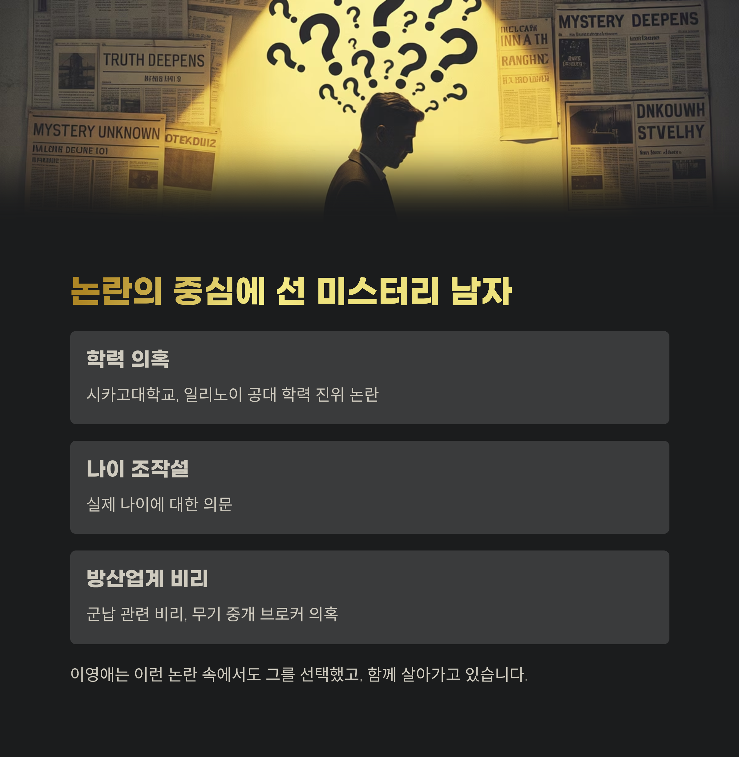 학력, 나이, 결혼 이력부터 방산업계 관련 비리 의혹까지. 무엇이 사실이고 무엇이 과장된 것인지 확인하기 어렵지만, 분명한 건 대중의 관심에서 자유로울 수 없는 인물이라는 점입니다.