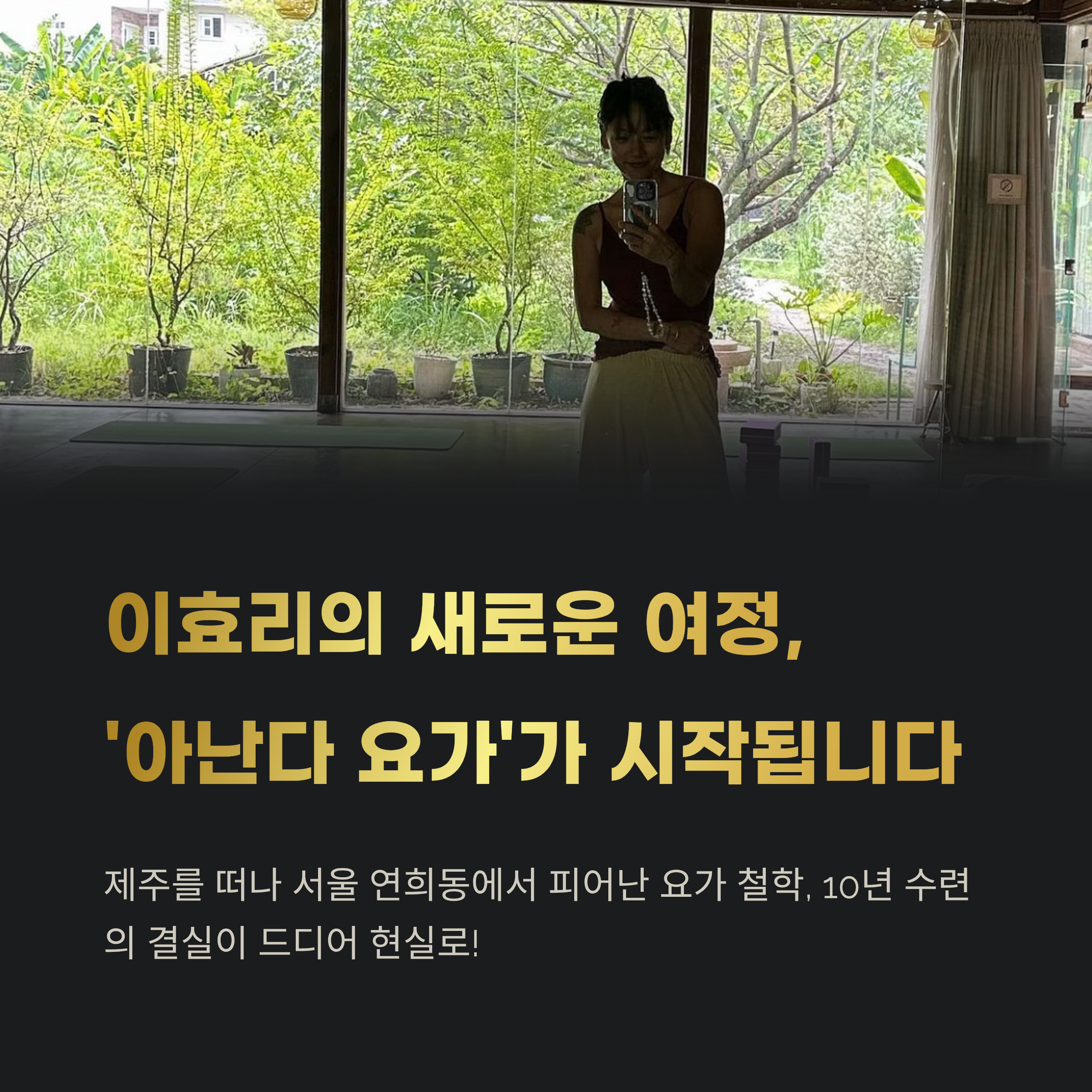 앞으로 ‘아난다 요가’는 이효리라는 이름을 넘어서, 몸과 마음이 편안해지는 진짜 웰니스 공간으로 자리 잡을 것입니다. 예약은 곧 시작되니, 관심 있으시다면 지금 인스타 팔로우부터 해두세요.