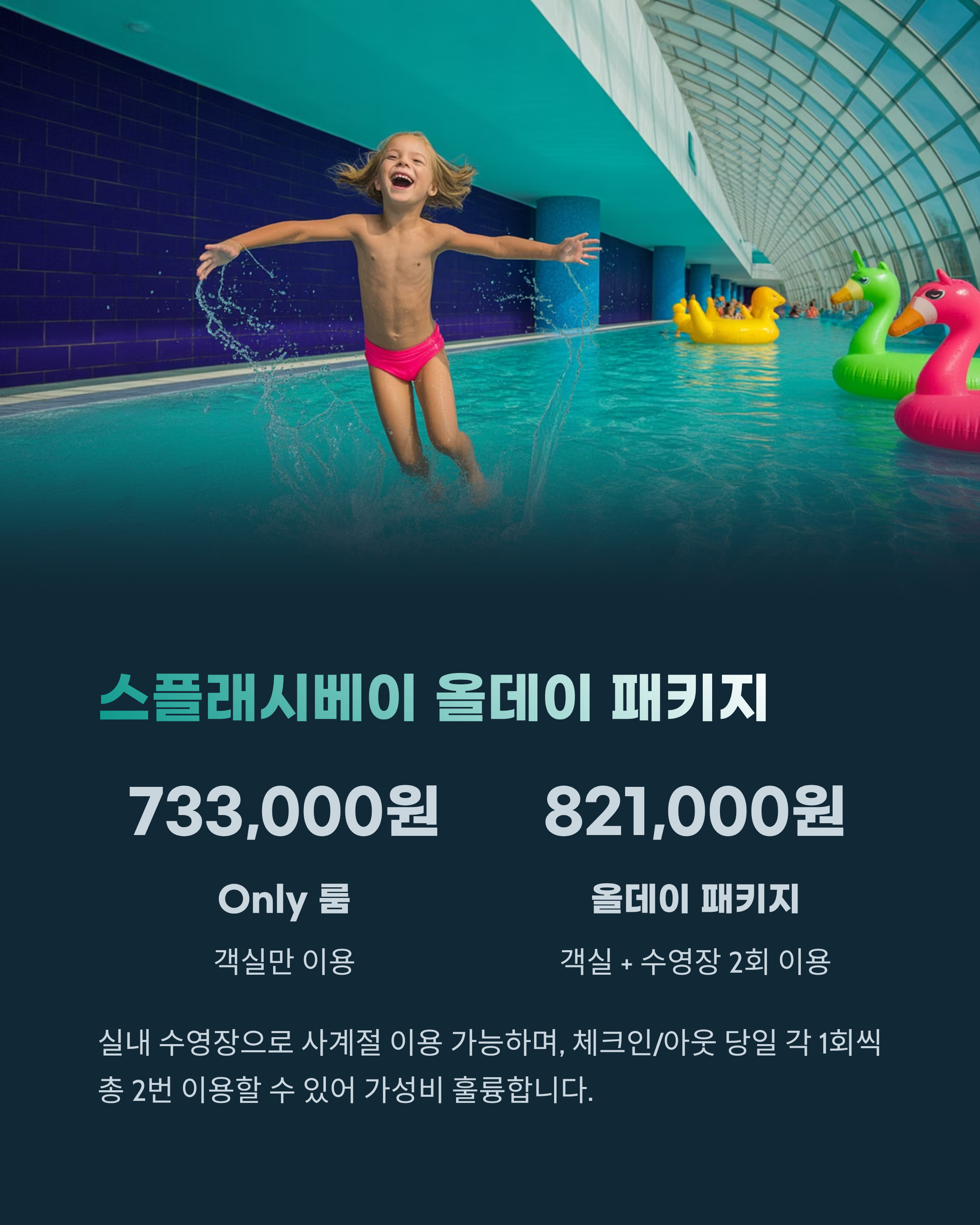 | 룸 + 올데이 패키지 | 821,000원 | 객실 + 수영장 2회 이용 |