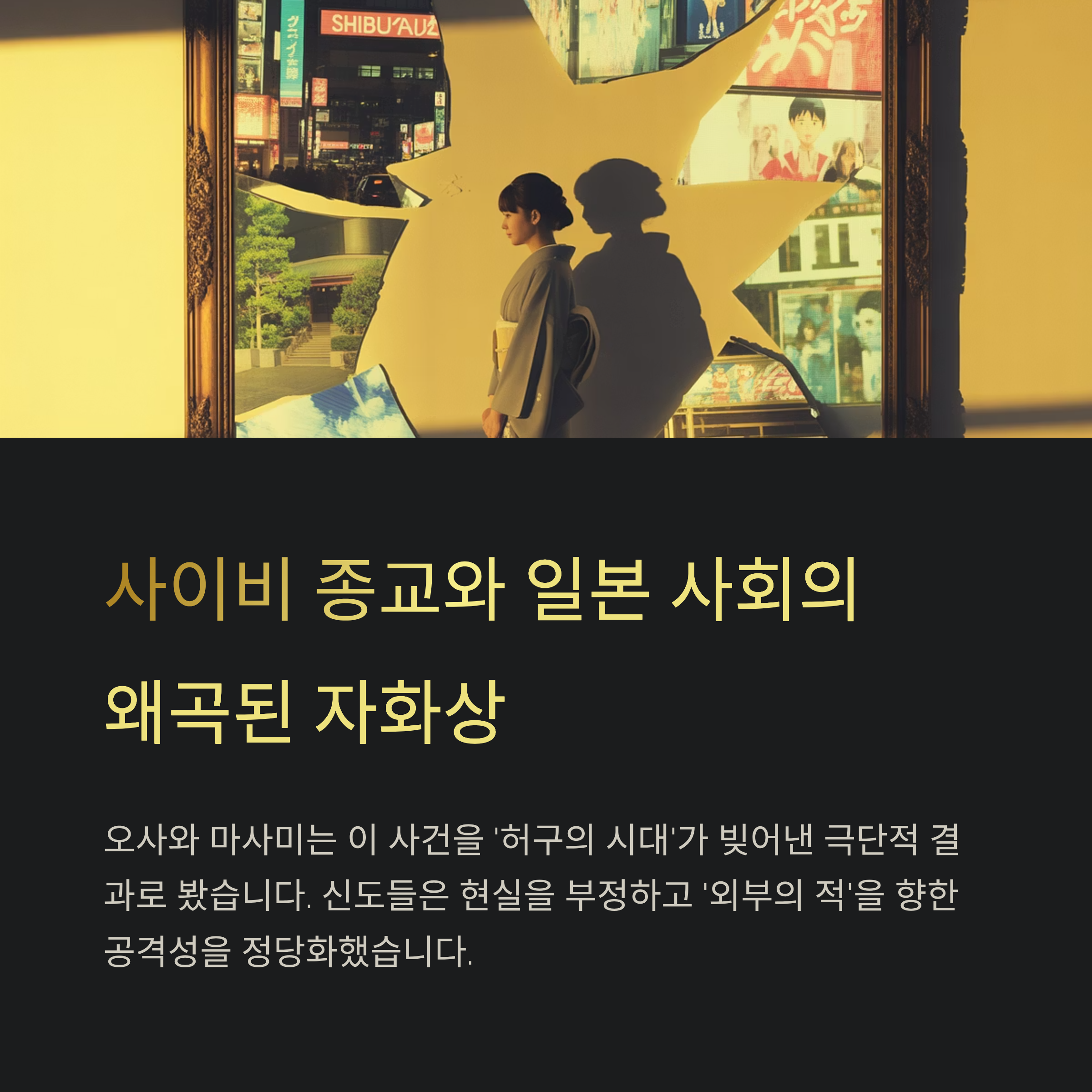 사건을 분석한 학자들은 옴진리교가 단순한 범죄 집단이 아닌, 현대 일본 사회의 왜곡된 자화상이라고 말합니다. 오사와 마사미는 이 사건을 ‘허구의 시대’가 빚어낸 극단적 결과로 봤습니다.