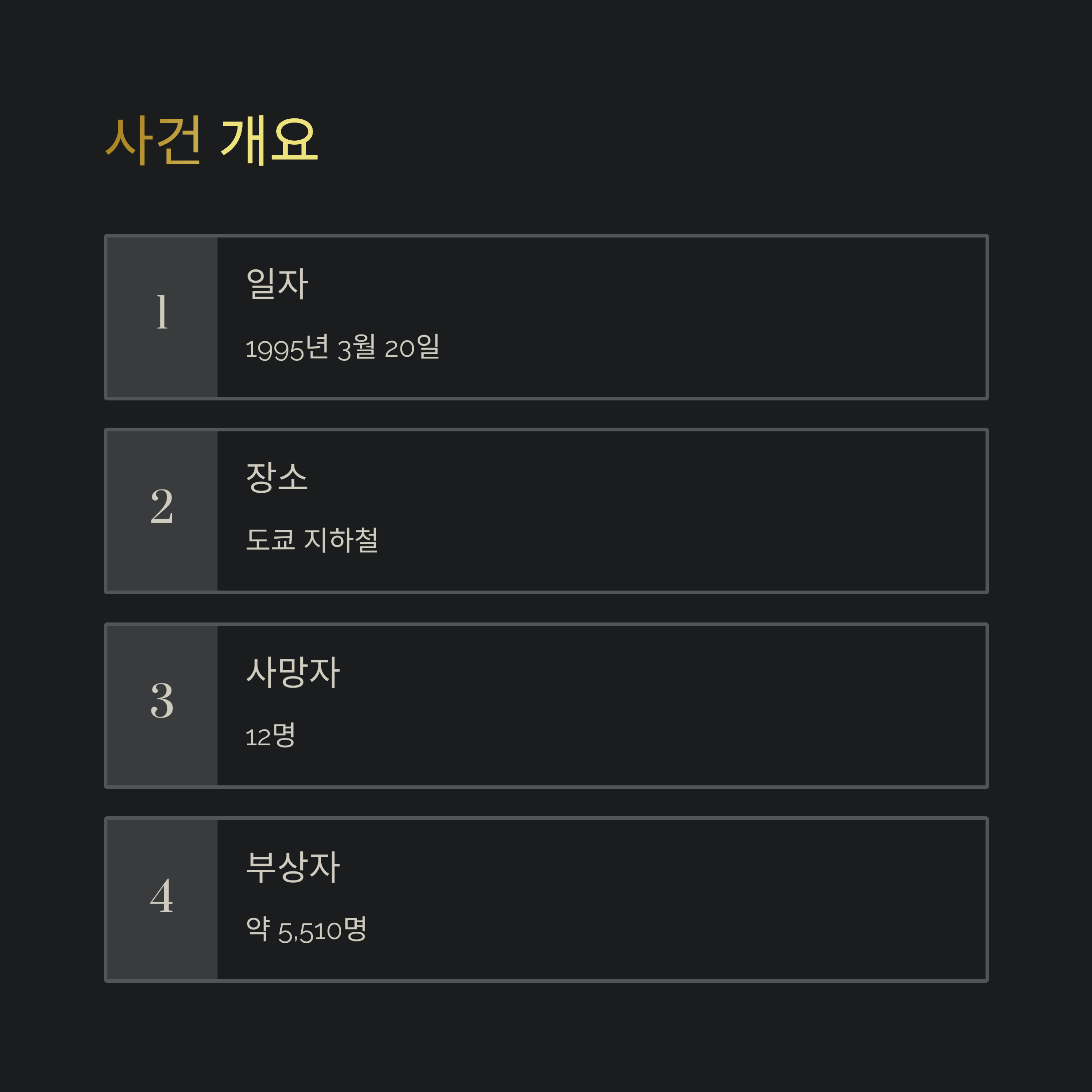 | 1995년 3월 20일 | 도쿄 지하철 | 12명 | 약 5,510명 |