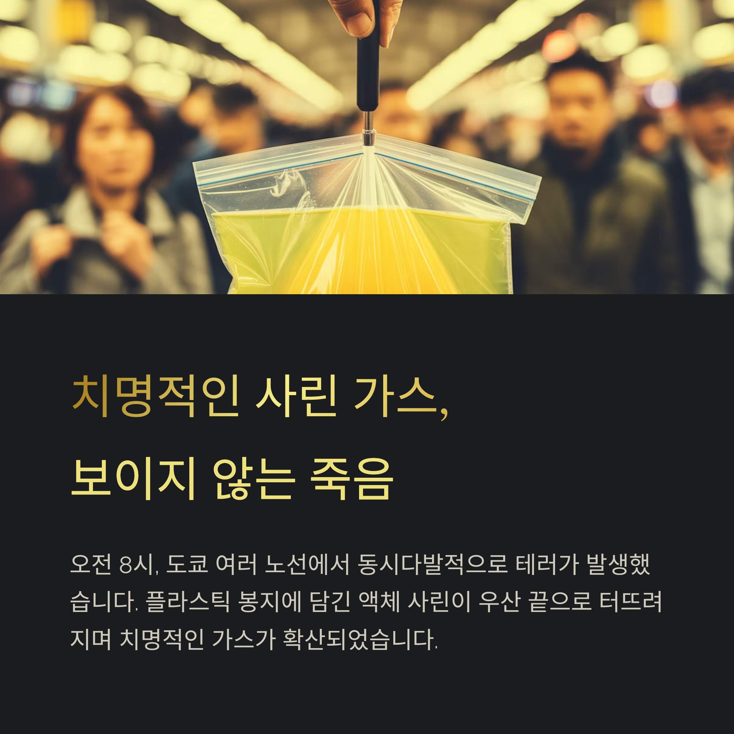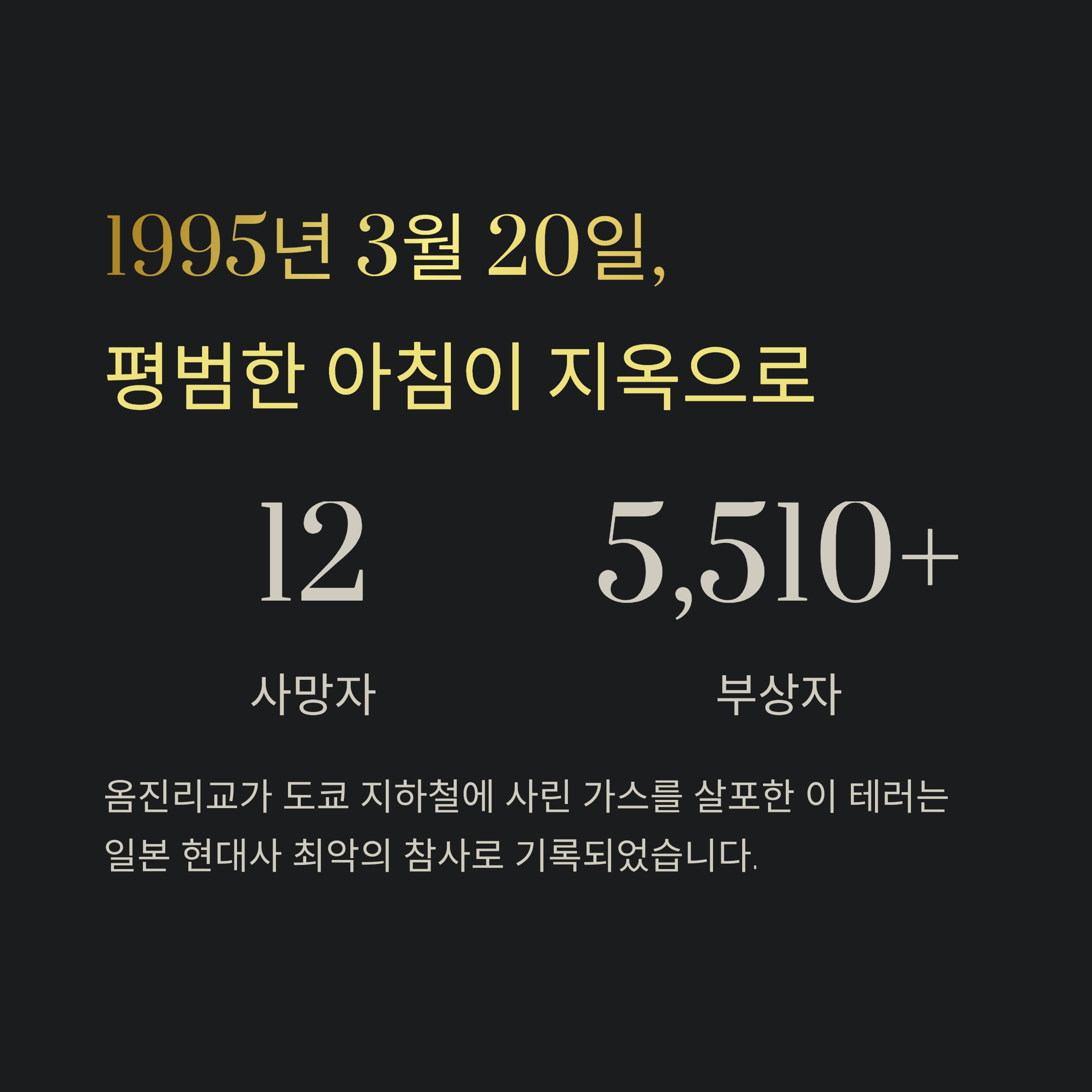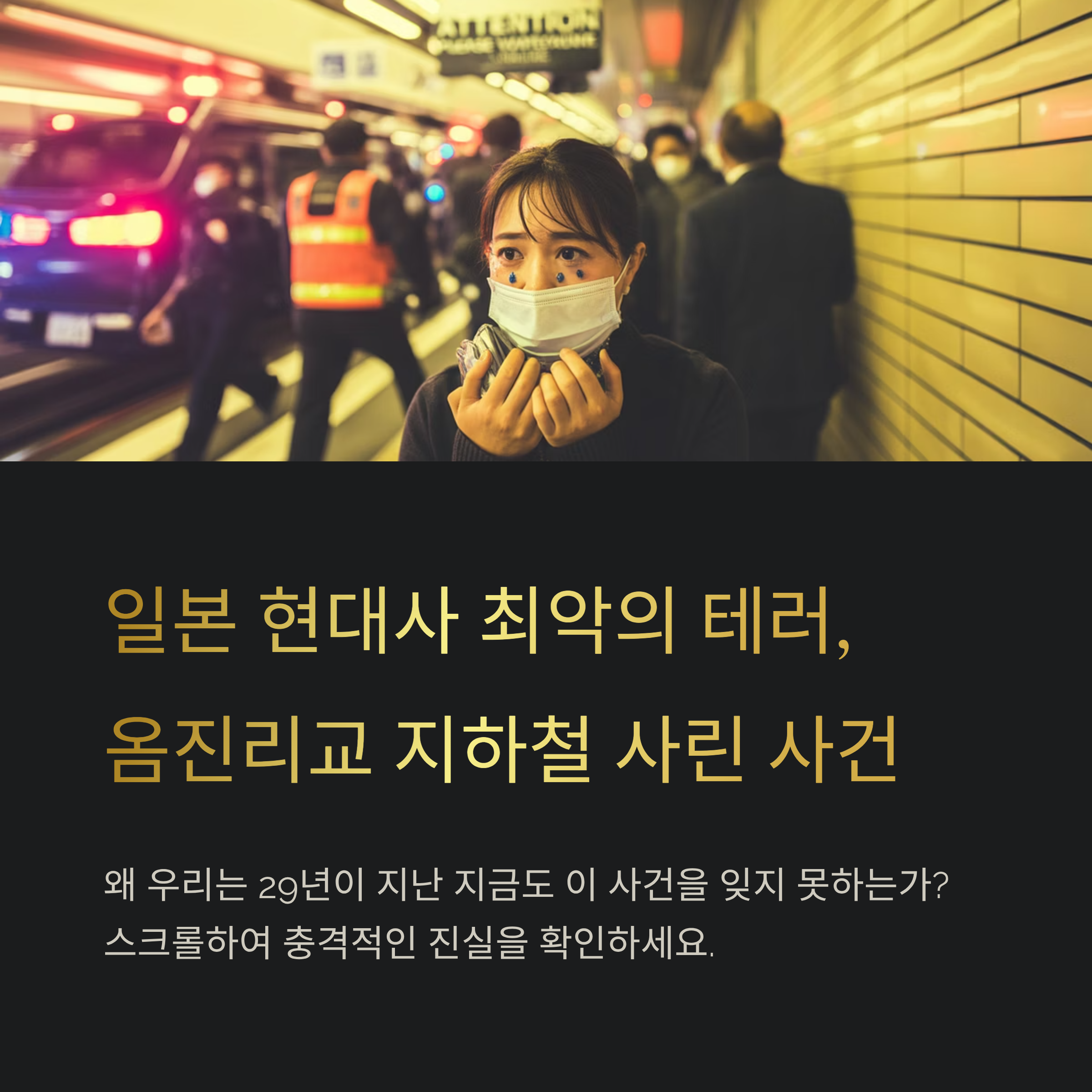 1995년 3월 20일, 도쿄 도심의 평범한 아침 출근길이 한순간에 지옥으로 변했습니다. 옴진리교라는 사이비 종교 집단이 지하철에 치명적인 신경가스인 사린을 살포한 이 테러는 일본은 물론 전 세계를 충격에 빠뜨렸습니다. 12명이 숨지고 5천 명이 넘는 시민이 부상을 입은 이 사건은, 일본 현대사 최악의 테러로 기억됩니다. 단순한 범죄 사건을 넘어 종교, 사회, 정부 시스템의 허점까지 드러낸 이 참사. 오늘날에도 여전히 많은 이들이 그날의 진실과 그 여파에 대해 질문을 던지고 있습니다.
