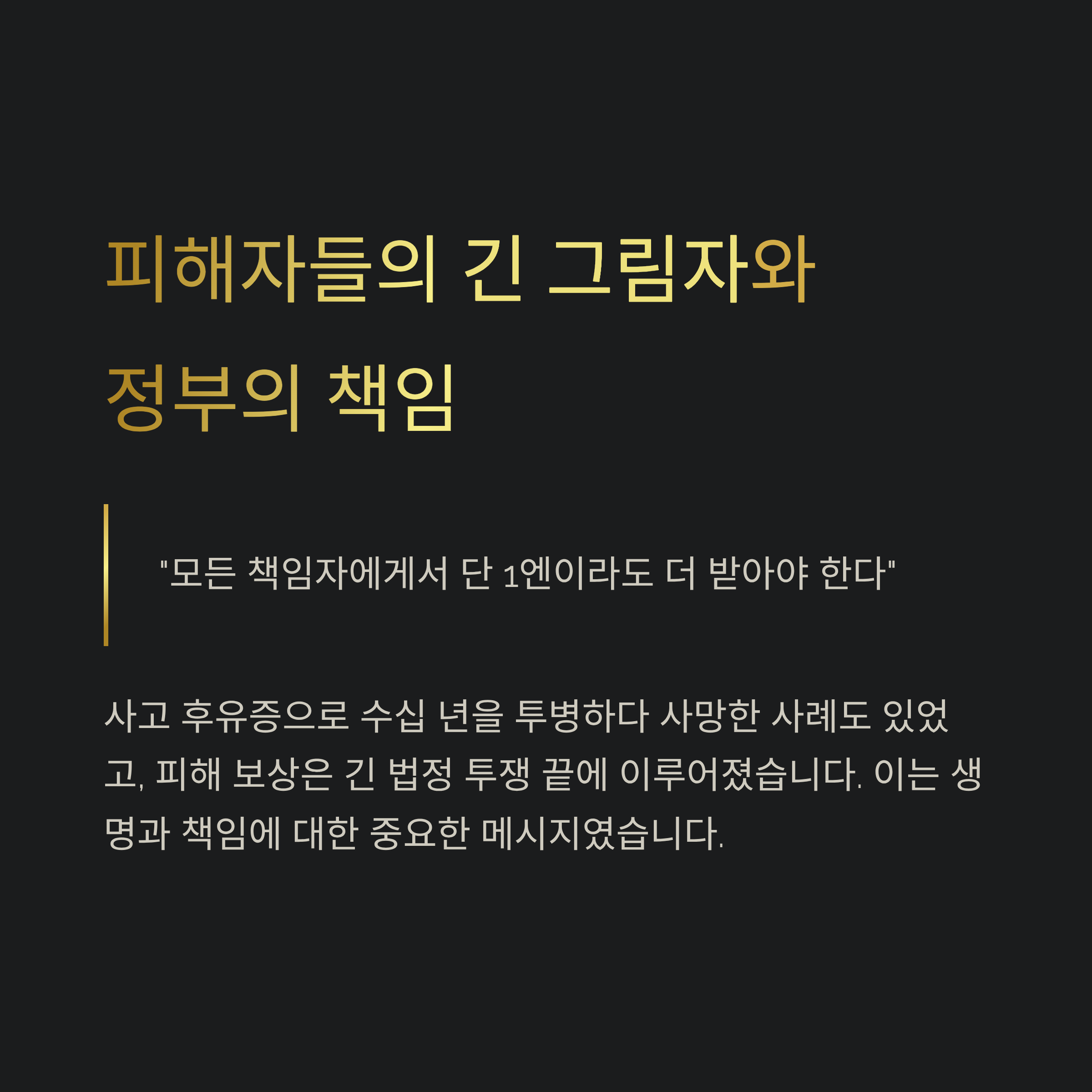 사고 후유증으로 수십 년을 투병하다 사망한 사례도 있었고, 피해 보상은 긴 법정 투쟁 끝에 이루어졌습니다. 한 피해자 유족은 "모든 책임자에게서 단 1엔이라도 더 받아야 한다"고 말했습니다.