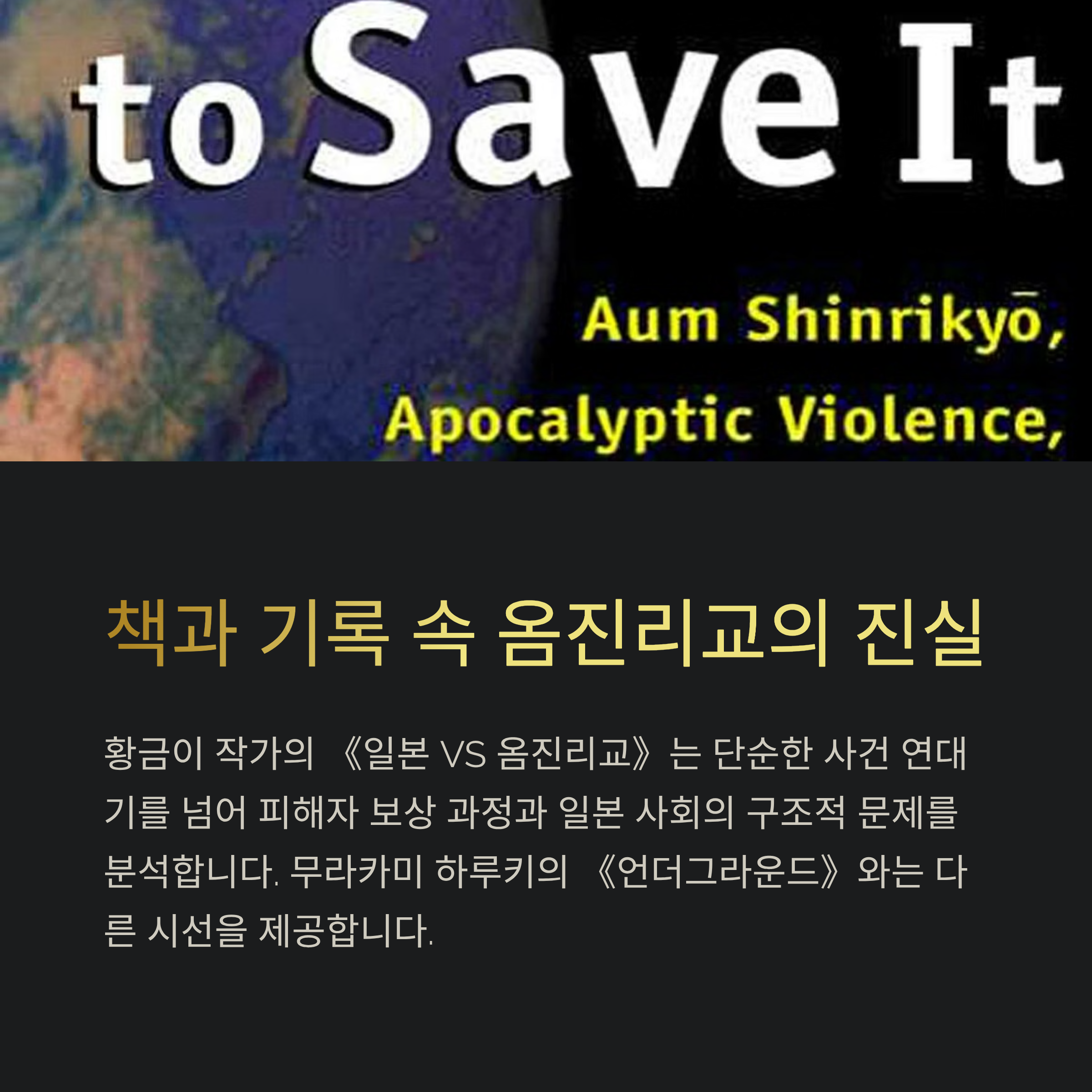 황금이 작가의 저서 《일본 VS 옴진리교》는 옴진리교의 역사를 집요하게 파헤칩니다. 이 책은 단순히 사건의 연대기를 정리하는 것을 넘어, 피해자 보상 과정과 일본 사회의 구조적인 문제를 분석합니다.