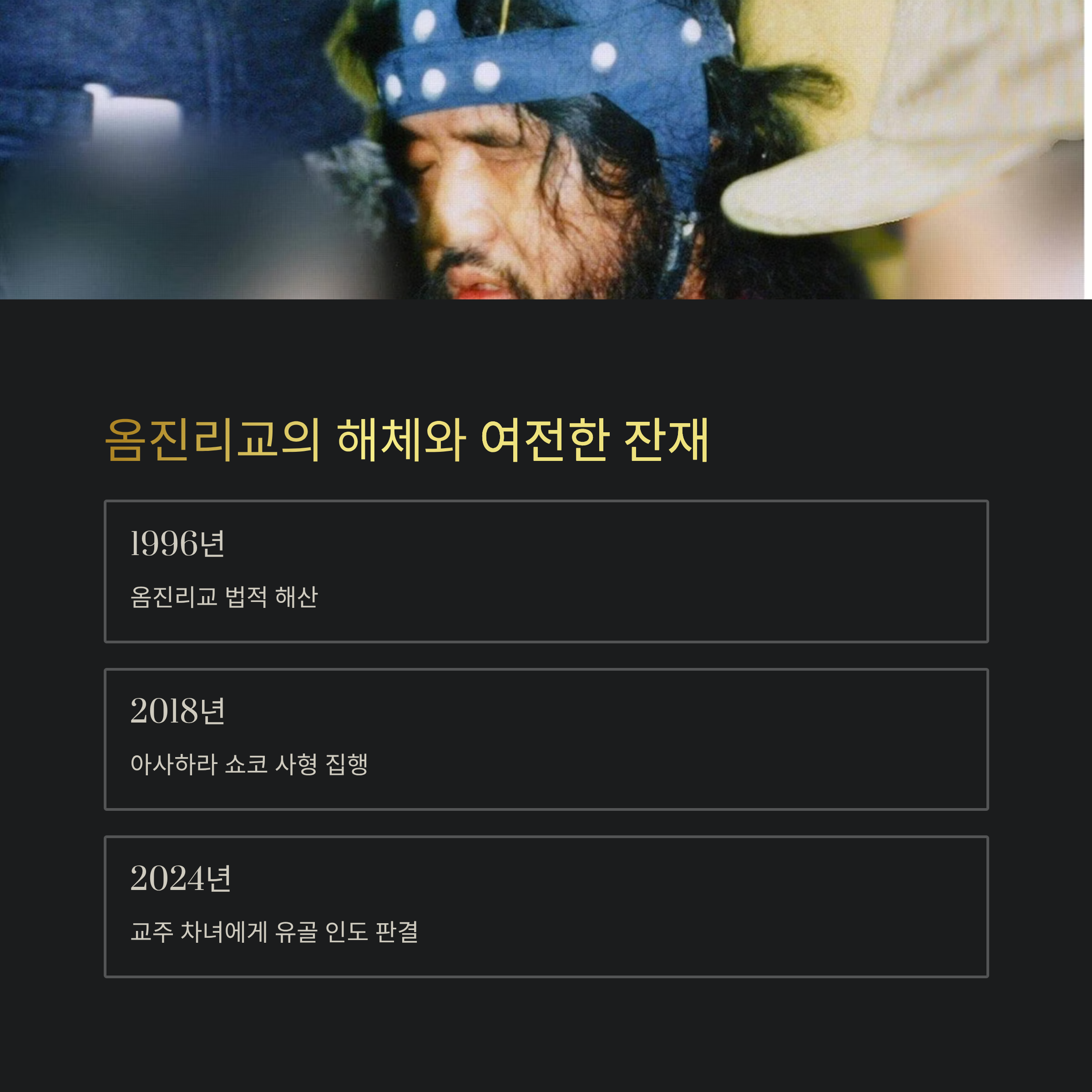 옴진리교는 1996년 법적으로 해산되었지만, 그 잔재는 여전히 존재합니다. 교주 아사하라는 2018년 사형이 집행되었고, 최근에는 그의 유골과 유발 소유권을 둘러싼 법적 분쟁이 이어지고 있습니다.