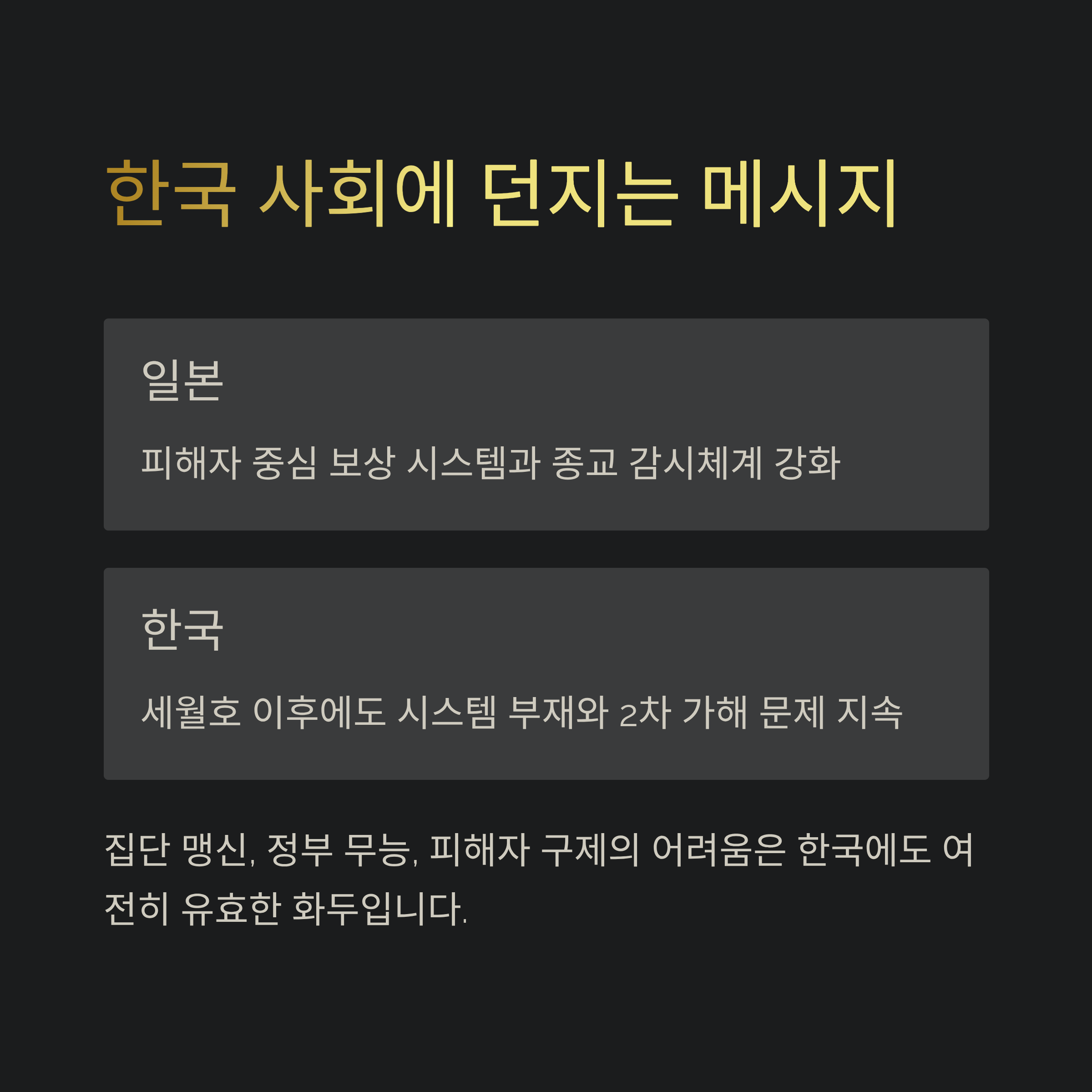 사건 이후 일본은 피해자 중심의 보상 시스템과, 종교에 대한 국가의 감시체계를 점차 강화했습니다. 반면, 한국은 세월호 참사 이후 보여준 분열과 2차 가해, 시스템 부재의 교훈을 아직 완전히 극복하지 못했습니다.