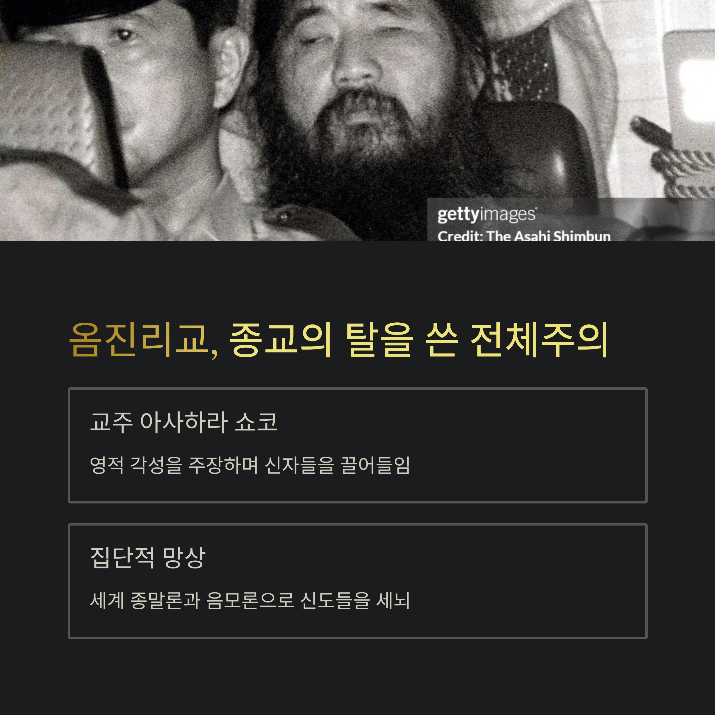옴진리교는 1980년대 말부터 일본에서 신흥 종교로 급속히 세를 확장하던 단체였습니다. 교주 아사하라 쇼코는 영적 각성을 주장하며 다수의 신자를 끌어들였지만, 실제로는 집단적 망상과 음모론, 세계 종말론을 퍼뜨렸습니다. 종교의 탈을 쓴 전체주의 집단이었던 셈이죠.
