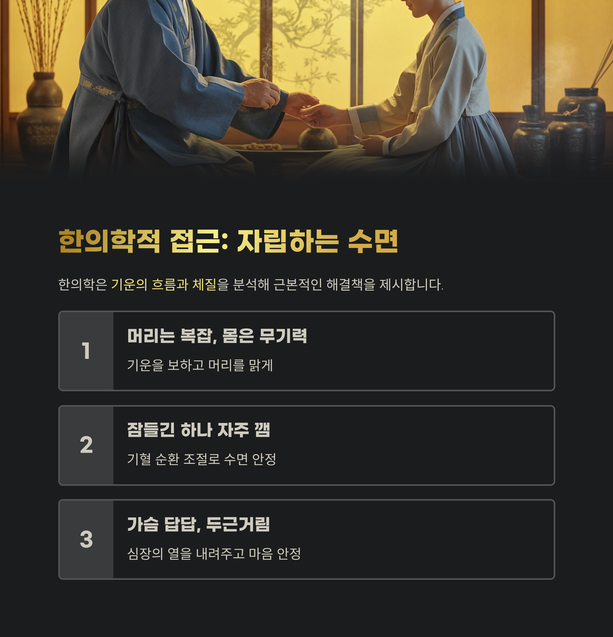 한의학적 접근은 기운의 흐름, 체질, 스트레스 요인 등을 분석하여 불면과 불안을 해결하는 데 초점을 둡니다.