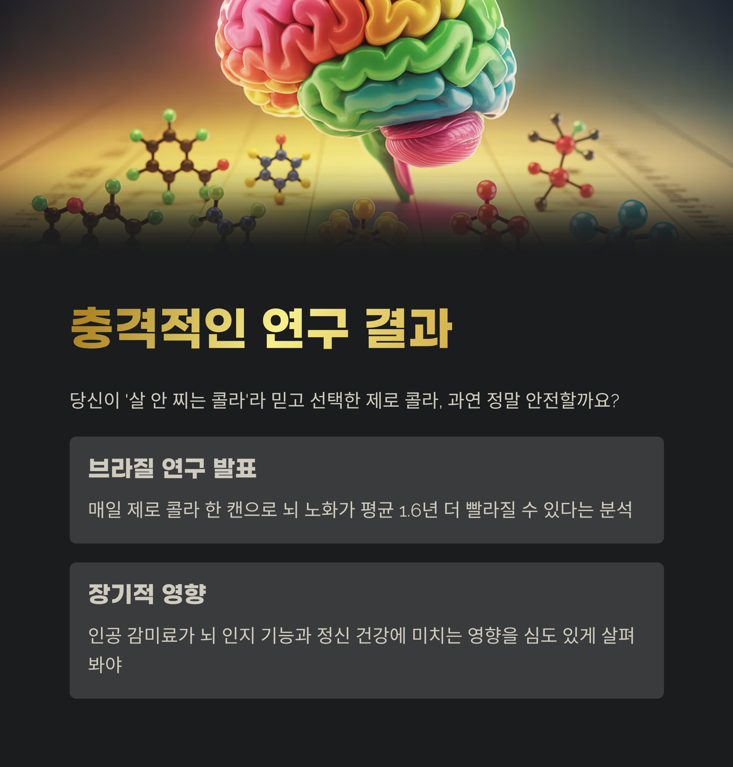 최근 발표된 브라질 연구 결과에 따르면, 매일 제로 콜라 한 캔을 마시는 것만으로도 뇌 노화가 평균 1.6년 더 빨라질 수 있다는 충격적인 분석이 나왔습니다. 인공 감미료가 당장 건강을 위협하는 것은 아니지만, 뇌 인지 기능과 장기적인 정신 건강에 어떤 영향을 미치는지를 심도 있게 들여다봐야 할 시점입니다. 오늘은 그 연구의 핵심 내용을 자세히 파헤쳐보겠습니다.
