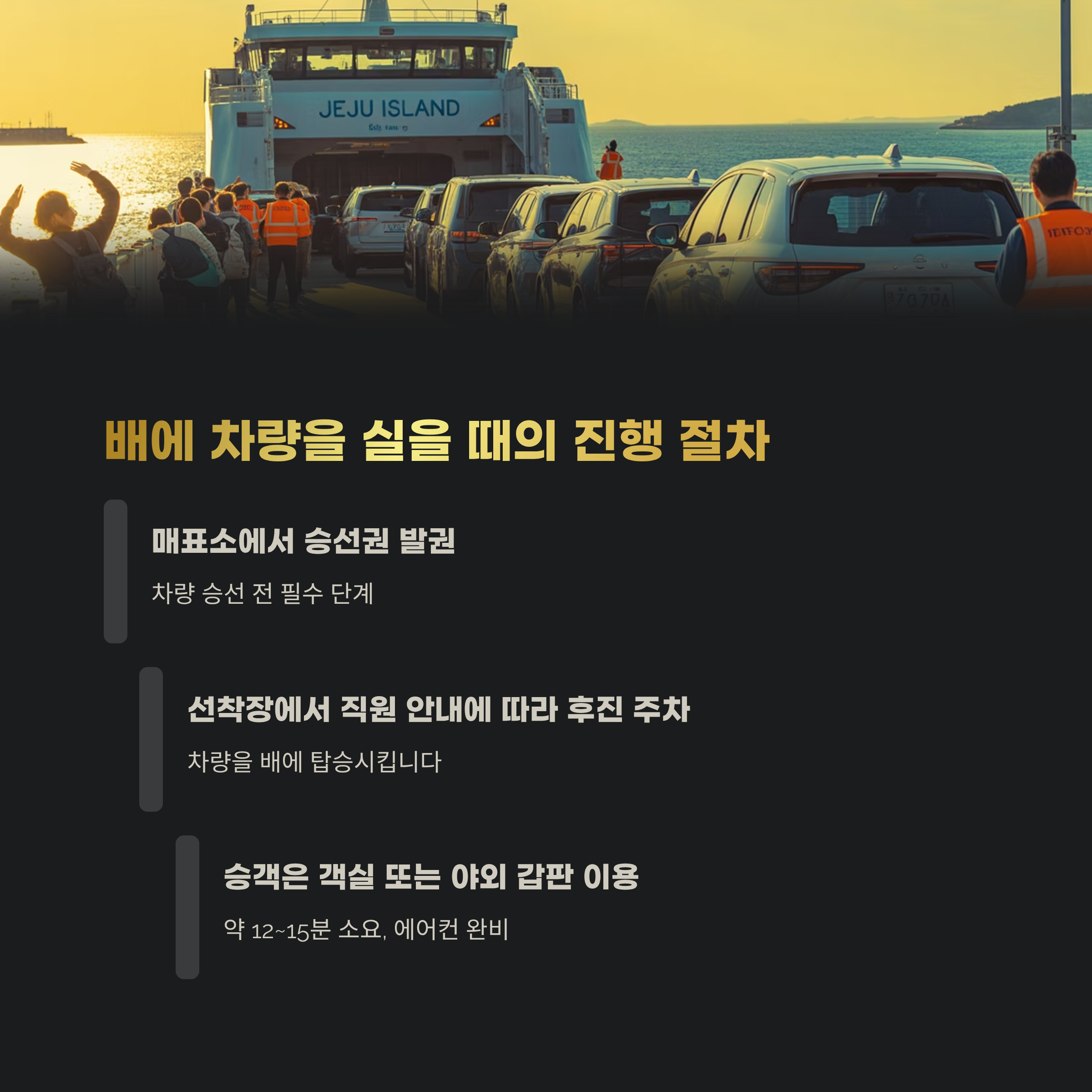 단, 차량을 선적하려면 반드시 매표소에서 승선권을 먼저 발권한 후, 차량을 선착장에 대야 합니다. 이 점을 놓치면 다시 돌아와야 하는 번거로움이 생길 수 있습니다.