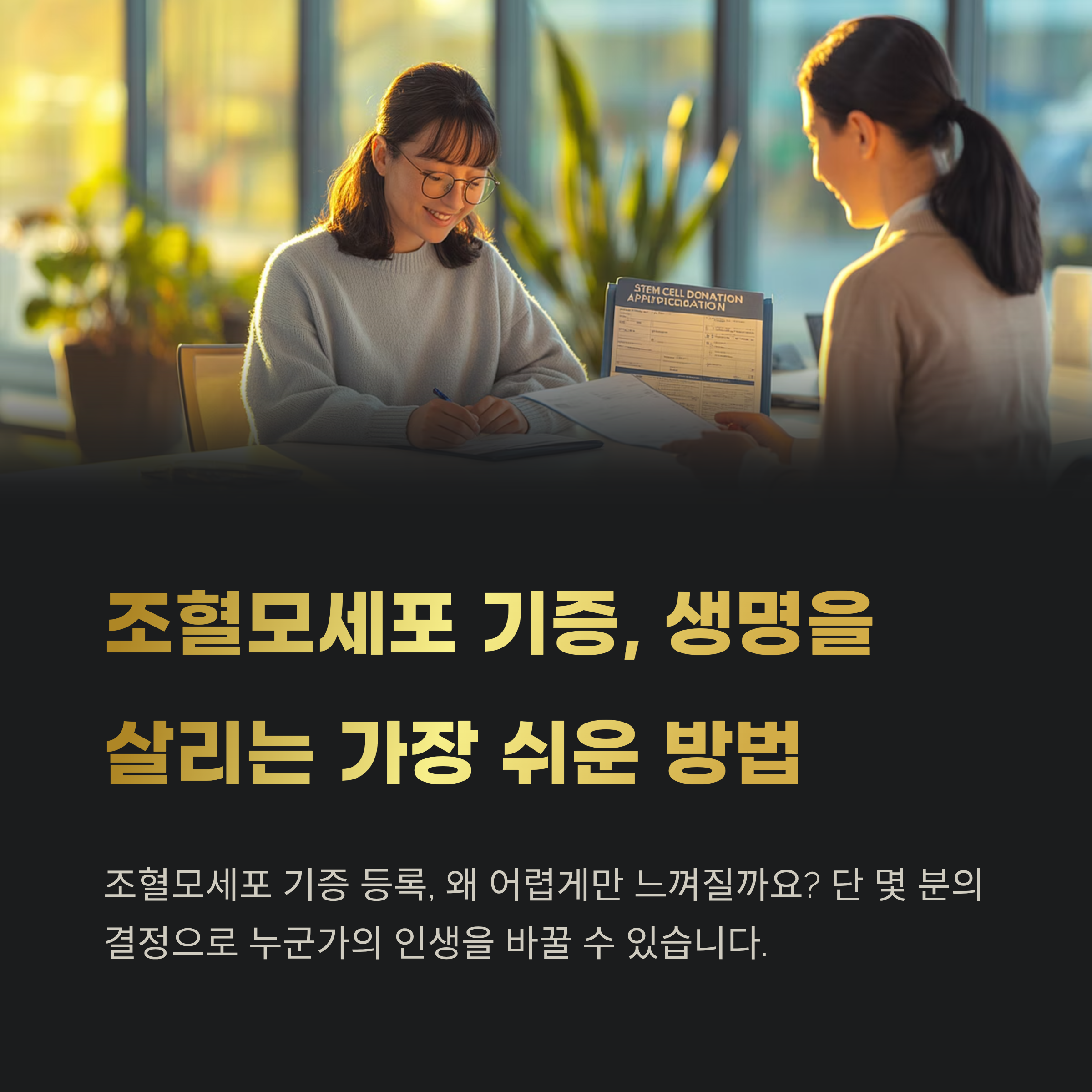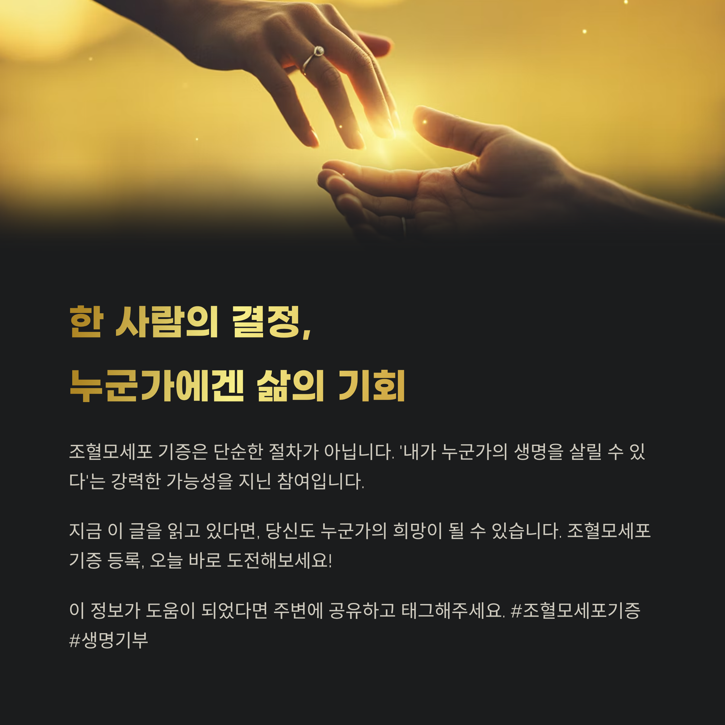 지금 이 글을 읽고 있다면, 당신도 누군가의 희망이 될 수 있습니다. 조혈모세포 기증 등록, 오늘 바로 도전해보는 건 어떨까요?
