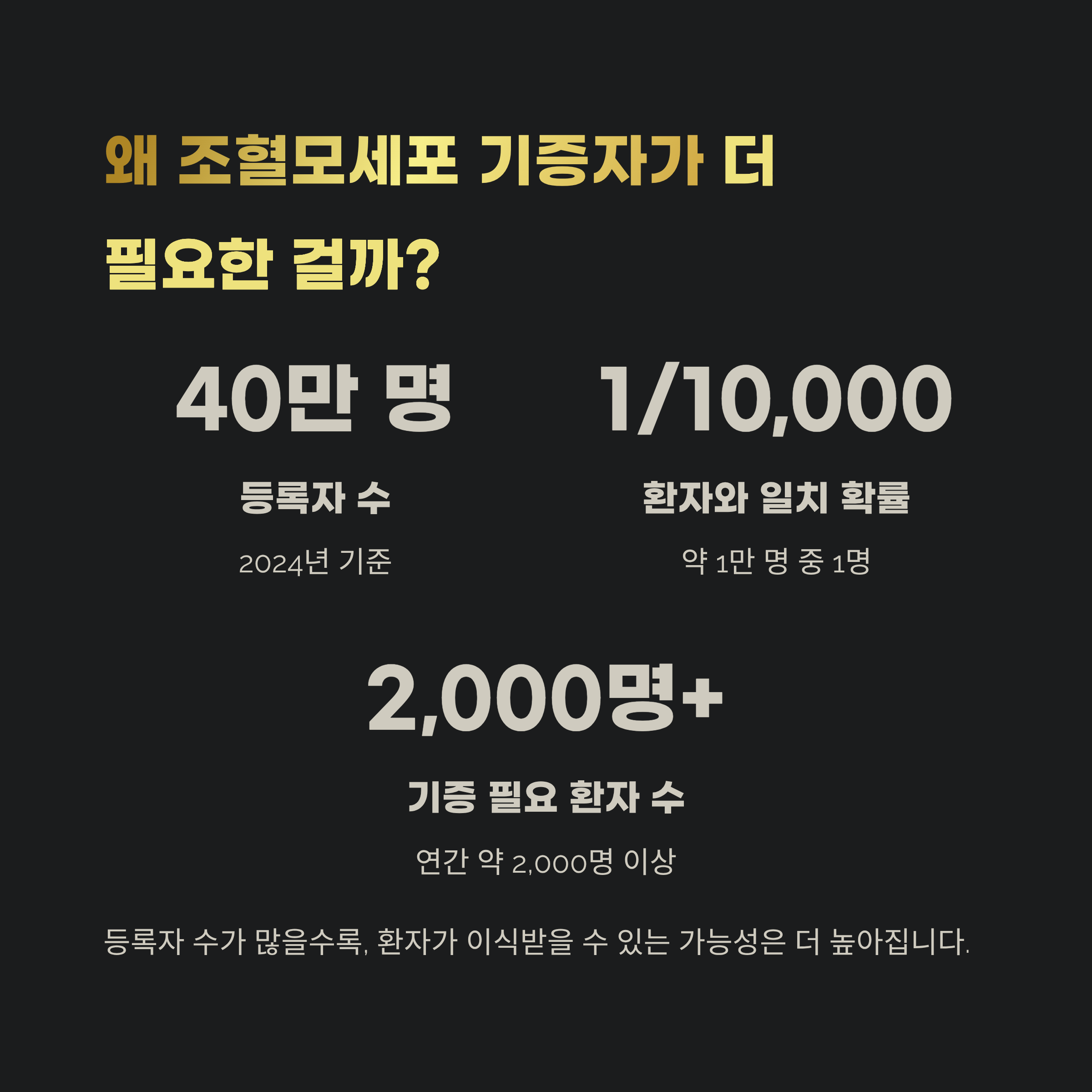 아래 통계를 보면, 왜 더 많은 기증자 등록이 필요한지 단번에 이해됩니다.