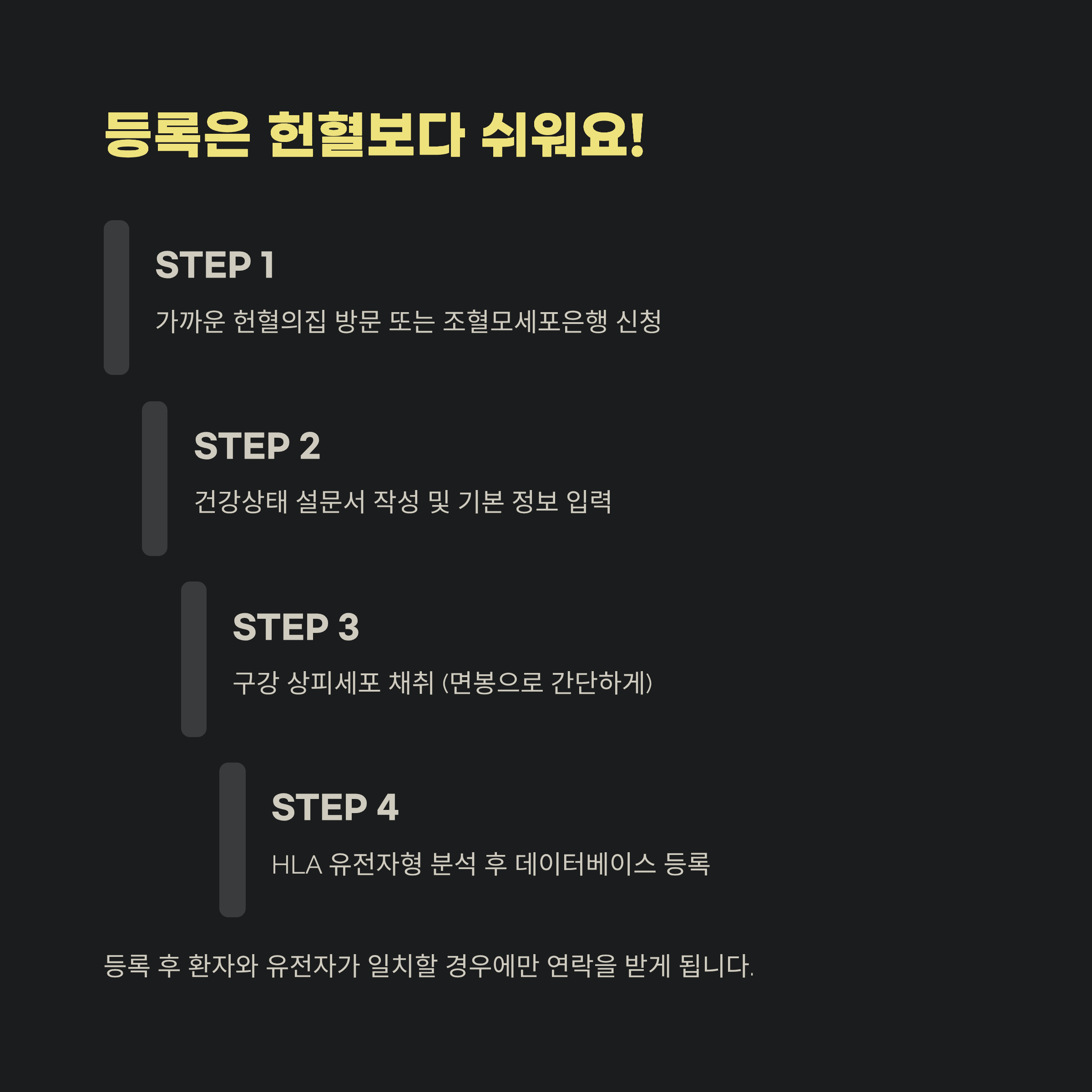 등록이 완료되면, 이후 환자와 유전자가 일치할 경우에만 연락을 받게 됩니다. 그때 실제 기증 여부는 다시 결정하시면 됩니다.