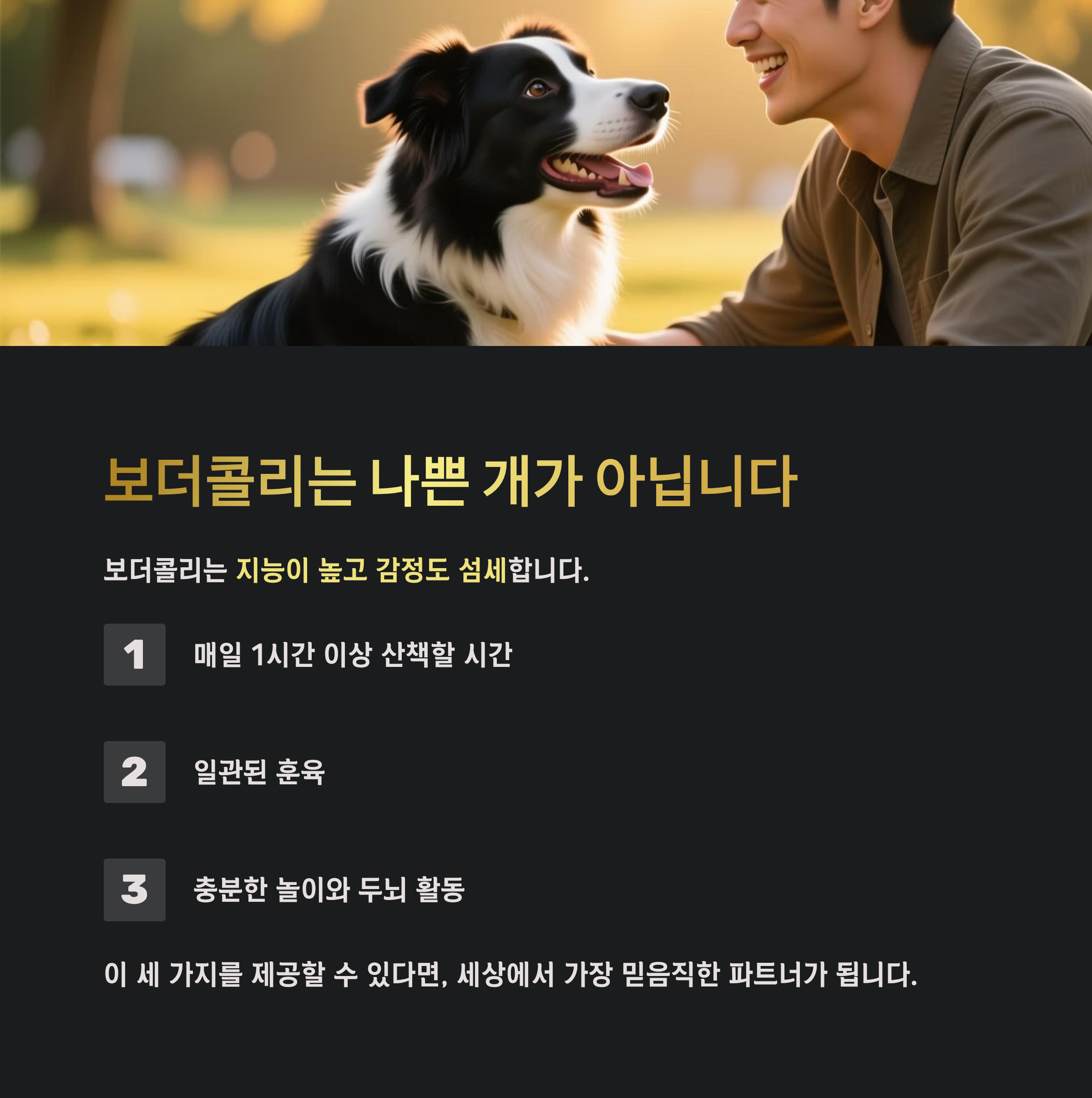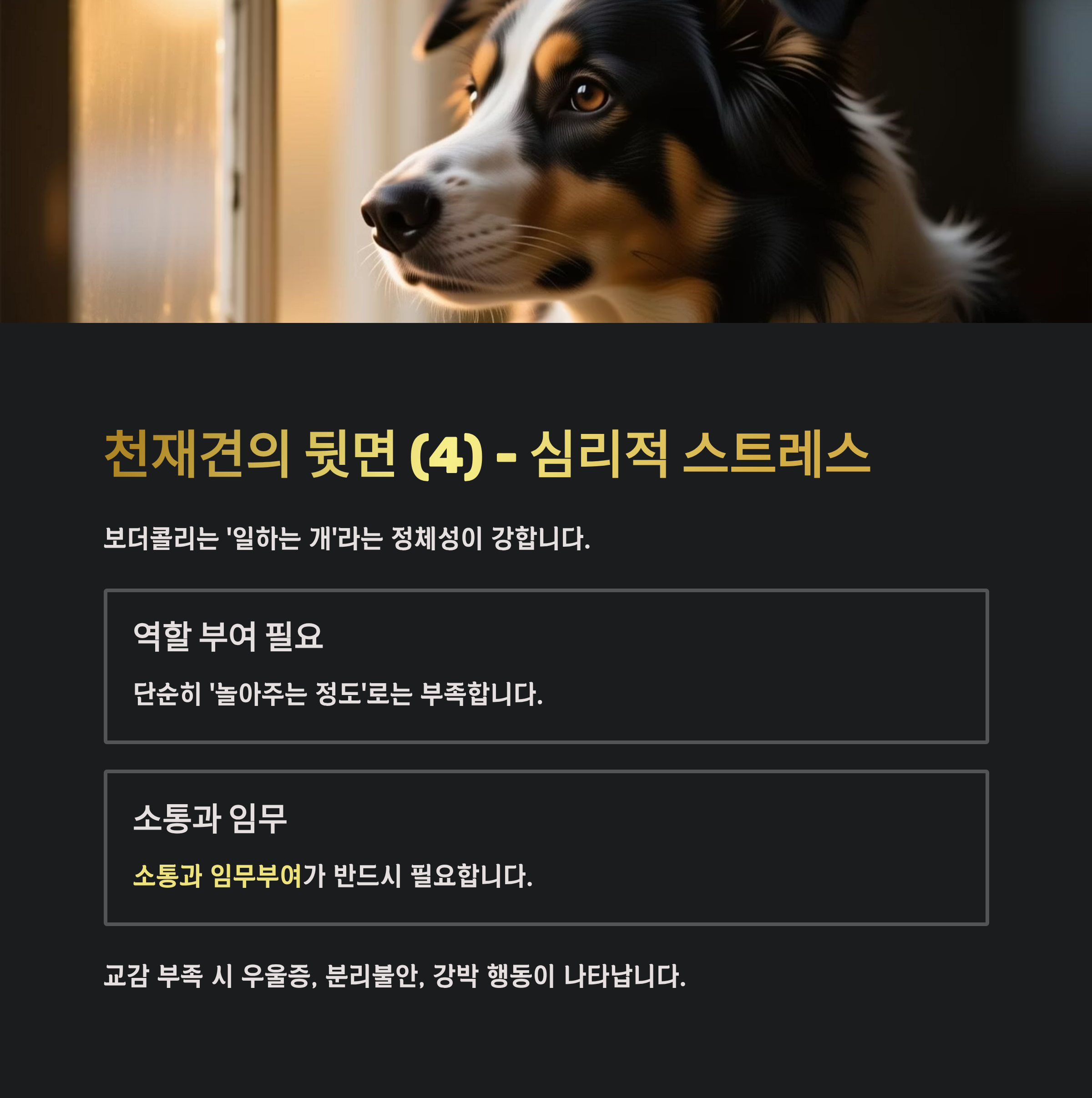 보더콜리는 ‘일하는 개’라는 정체성이 남아 있어서 교감이 부족하거나 역할이 주어지지 않으면