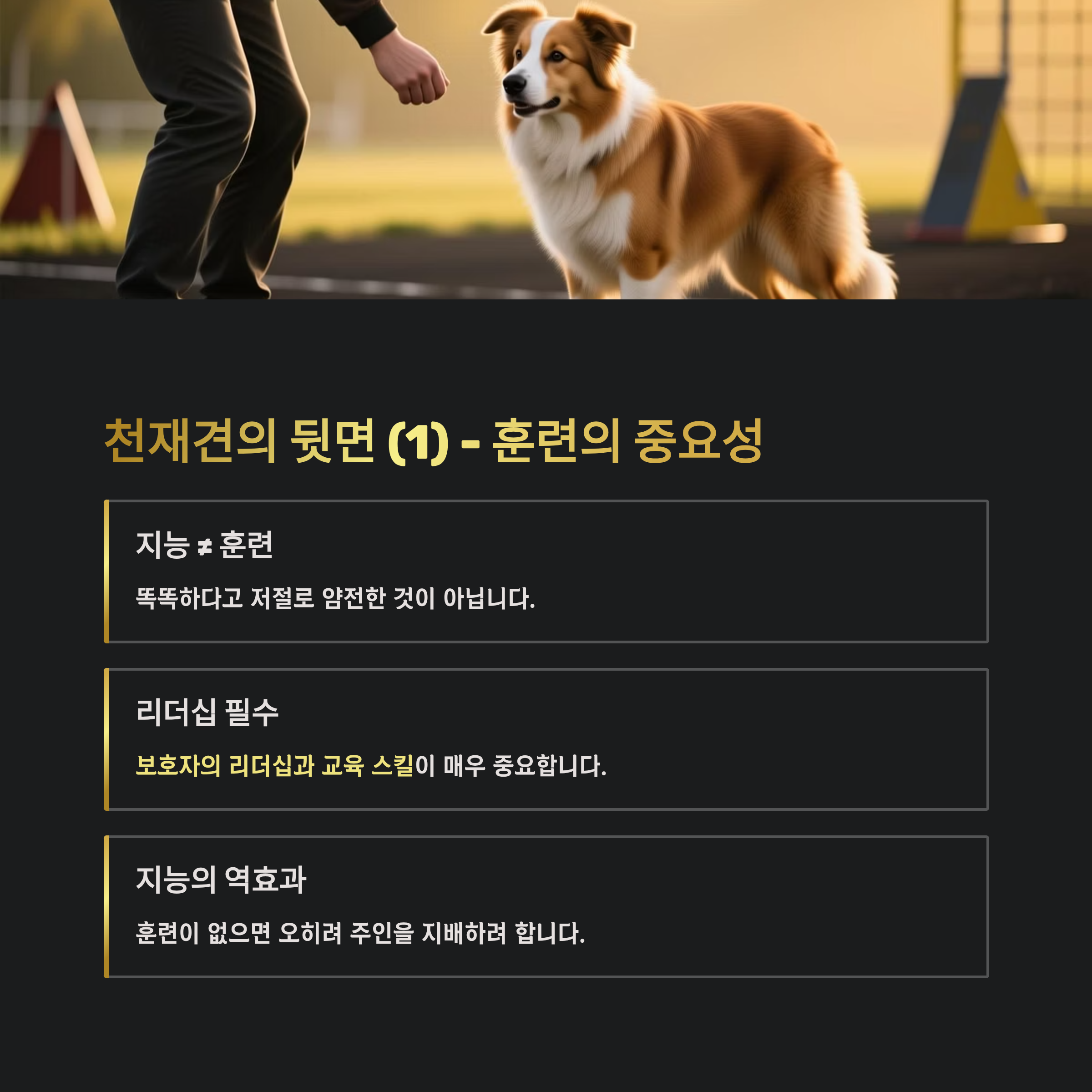 | “훈련을 안 하면 똑똑해서 보호자 무시해요.” | 리더십 약하면 행동 통제 어려움 |