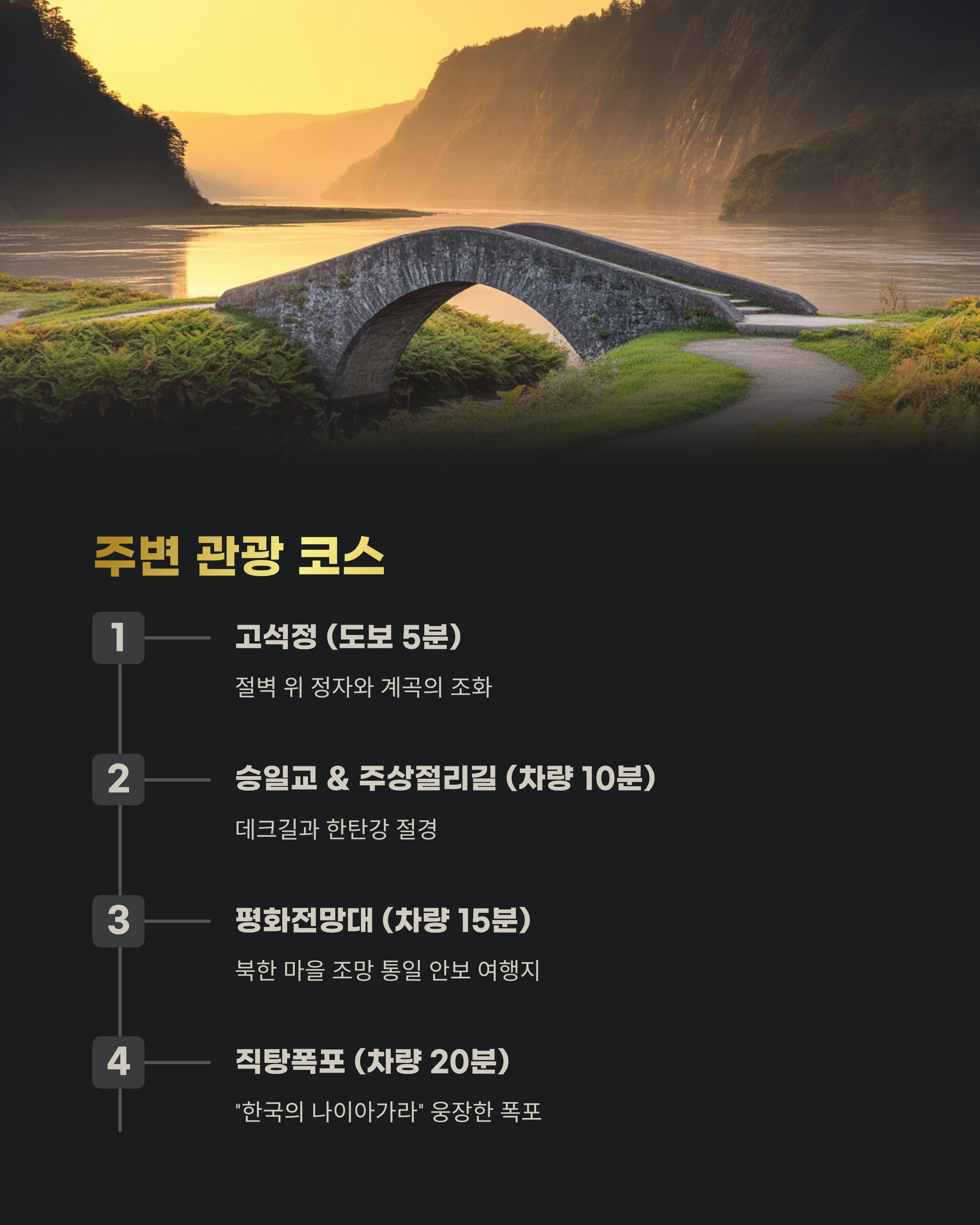 | 승일교 & 주상절리길 | 차량 10분 | 걷기 좋은 데크길과 한탄강 절경 |