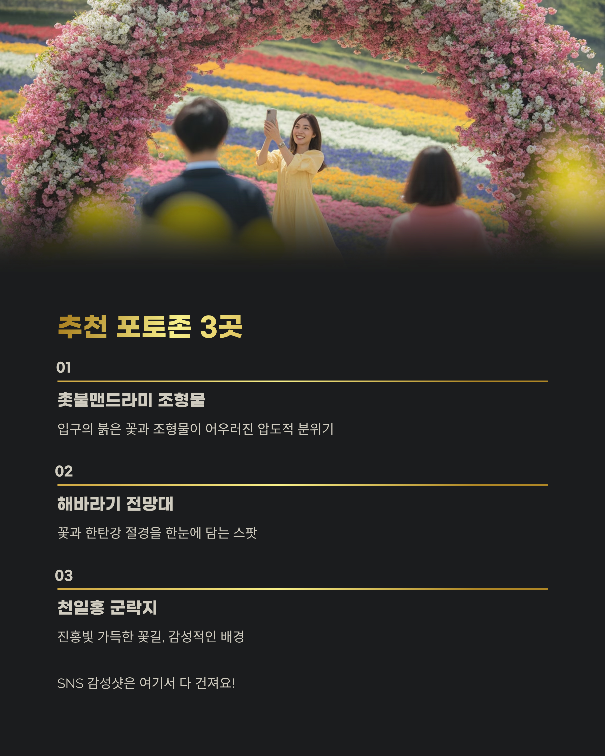 방문 시작부터 핫한 장소. 붉은 꽃과 조형물이 어우러져 압도적인 분위기. - 포토존 2: 해바라기 전망대