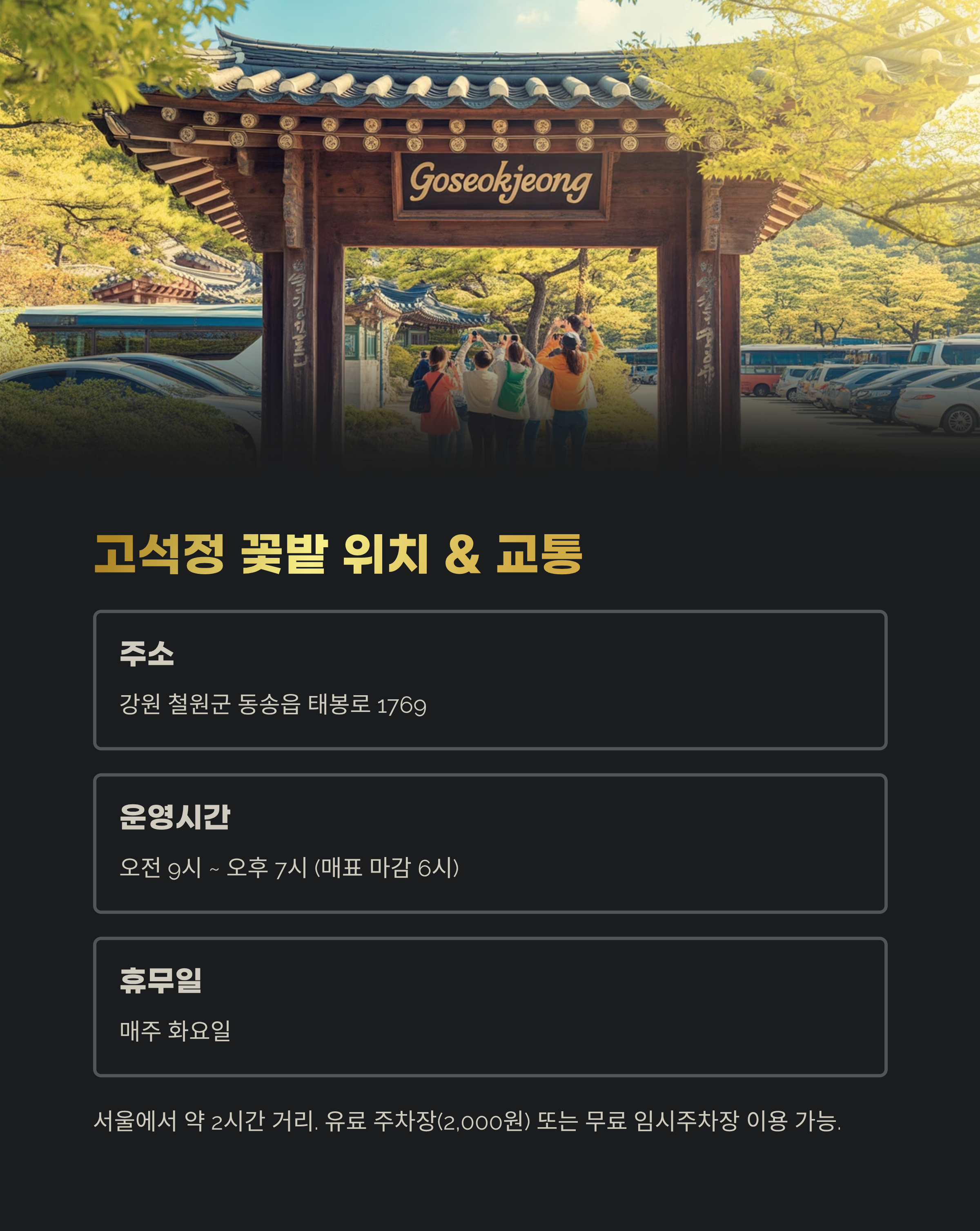 자차로는 서울에서 약 2시간 거리이며, 내비게이션에 “고석정 국민관광지”만 입력하면 정확히 안내됩니다.