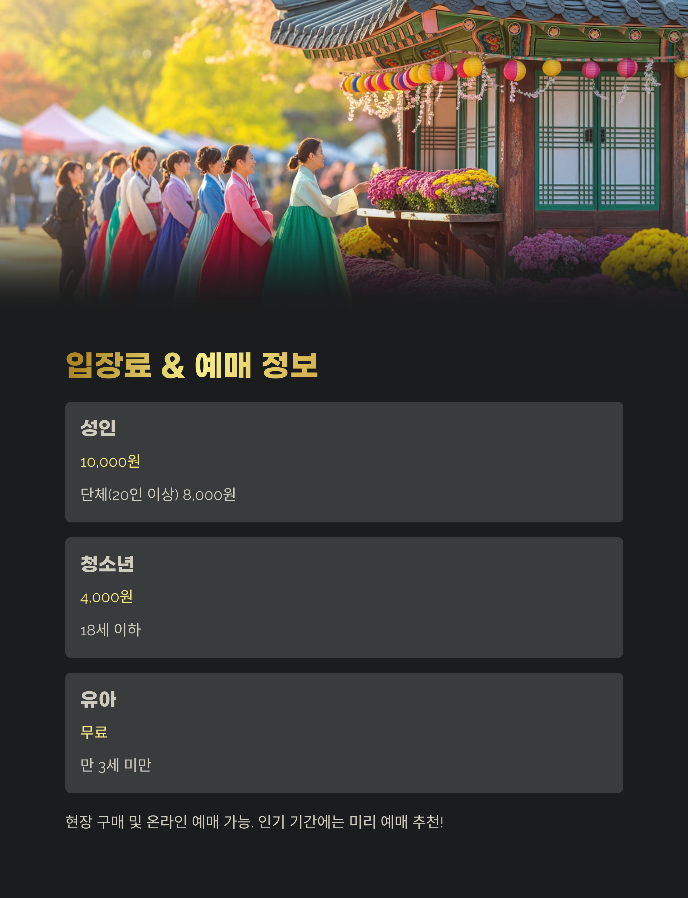 | 인터넷 예매 | 가능 | 현장 매표소 및 온라인 동시 운영 |