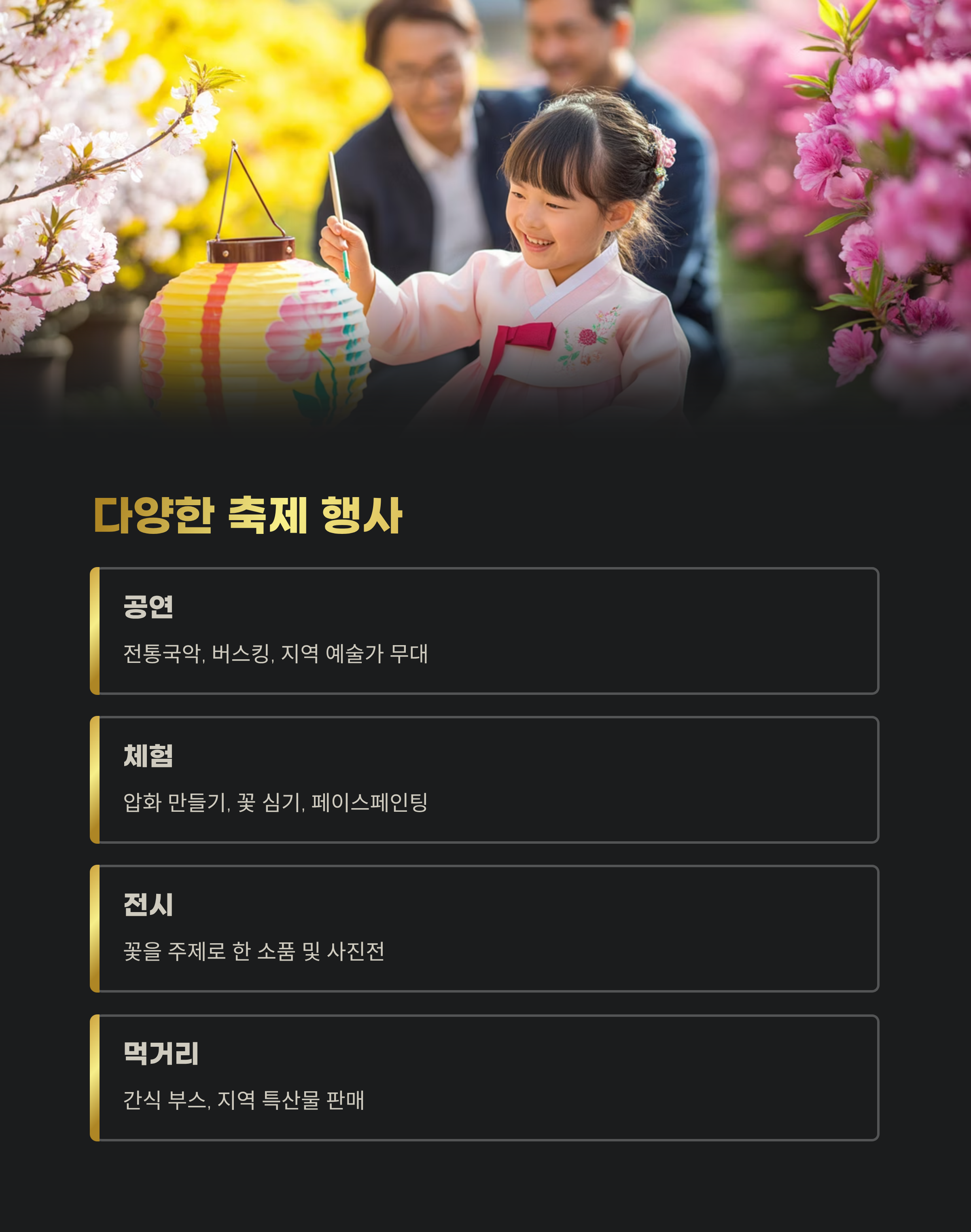 | 공연 | 전통국악, 버스킹, 지역 예술가 무대 |