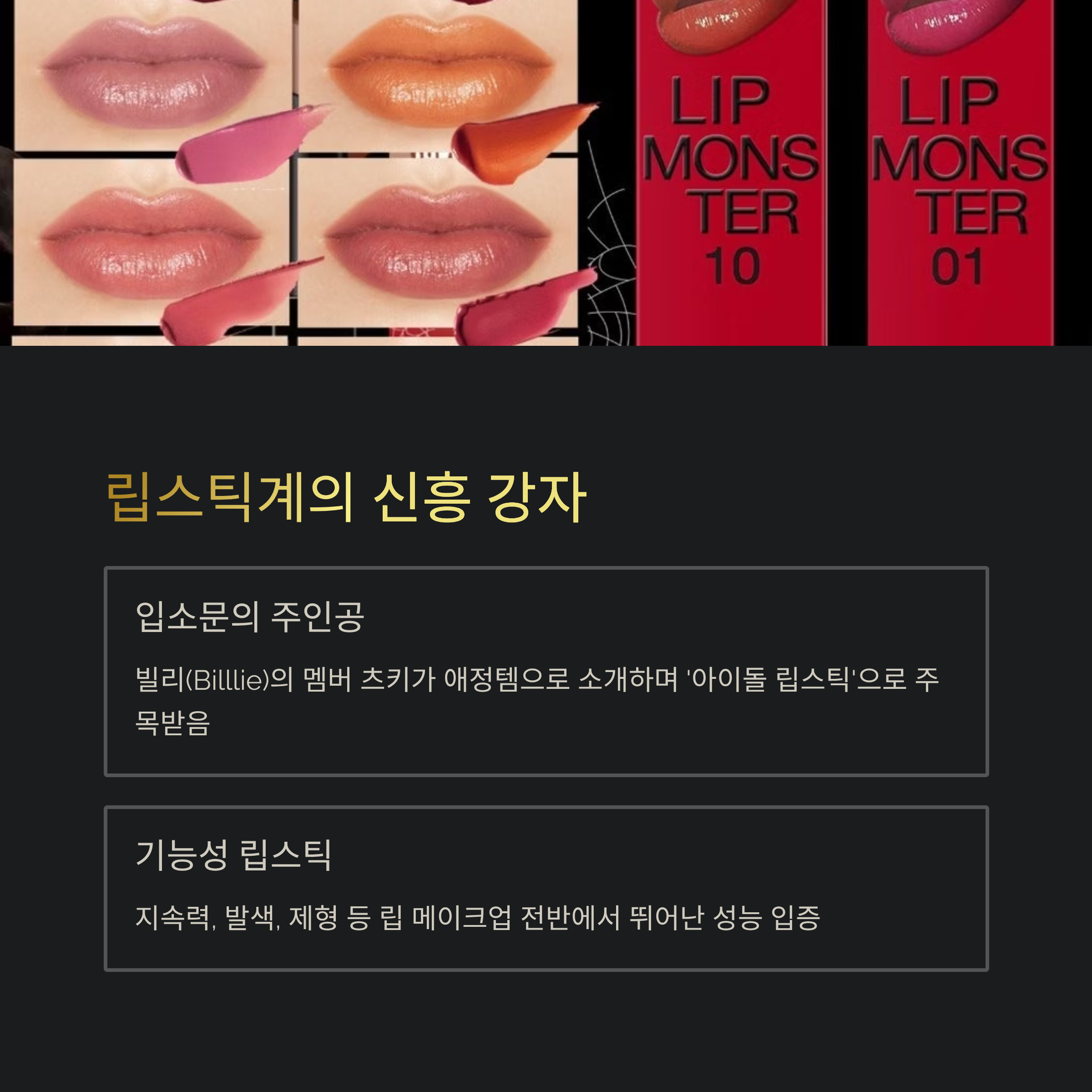 일반적으로 글로시한 립은 끈적임과 묻어남이 문제로 지적됩니다. 하지만 립몬스터는 광택은 유지하되 묻어남을 줄인 기술력으로 차별화에 성공했죠.