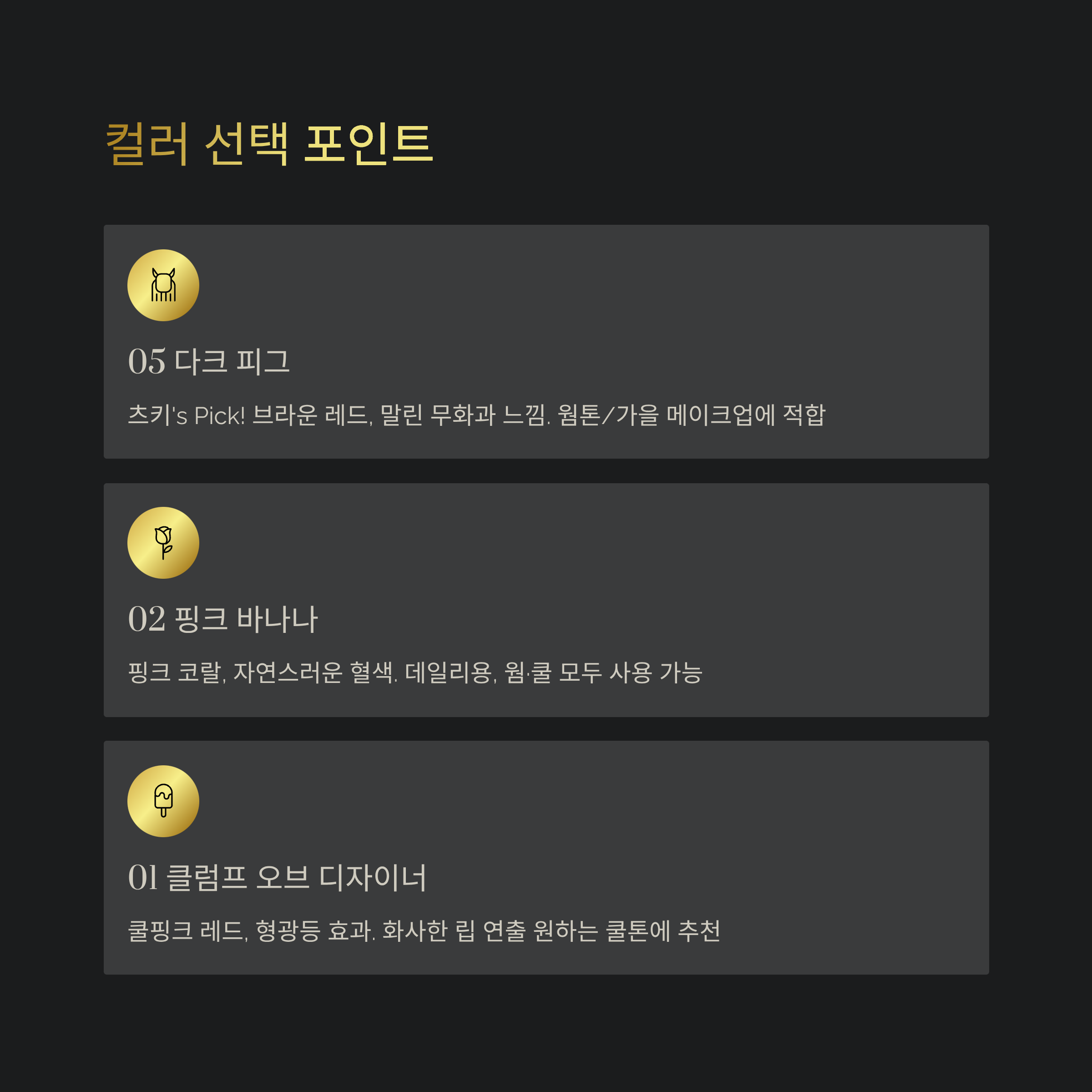 | 02 핑크 바나나 | 핑크 코랄, 자연스러운 혈색 | 데일리용, 웜·쿨 모두 사용 가능 |