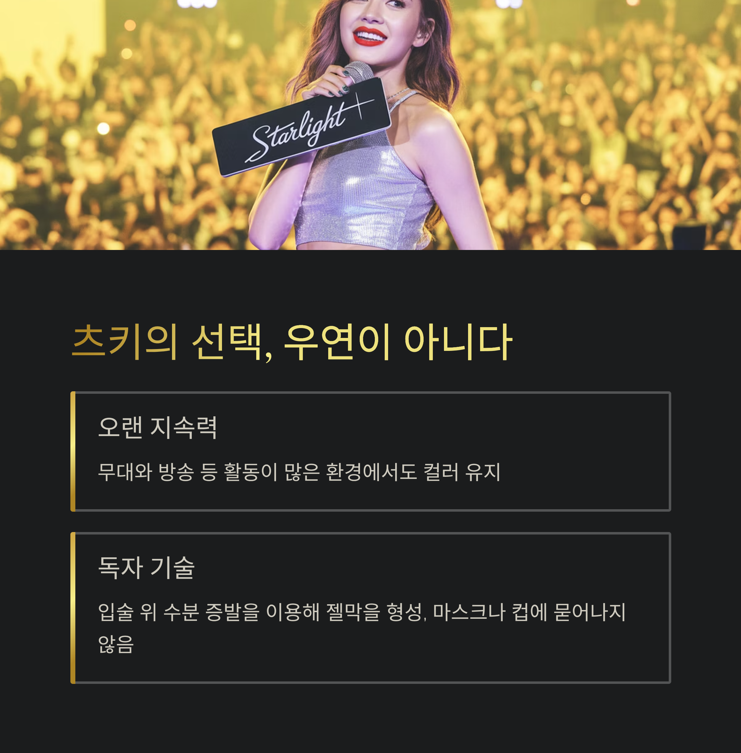 츠키는 실제 무대와 방송 등 활동이 많은 환경 속에서도 이 립스틱을 추천한 이유로 오랜 지속력과 뛰어난 고정력을 꼽았습니다.