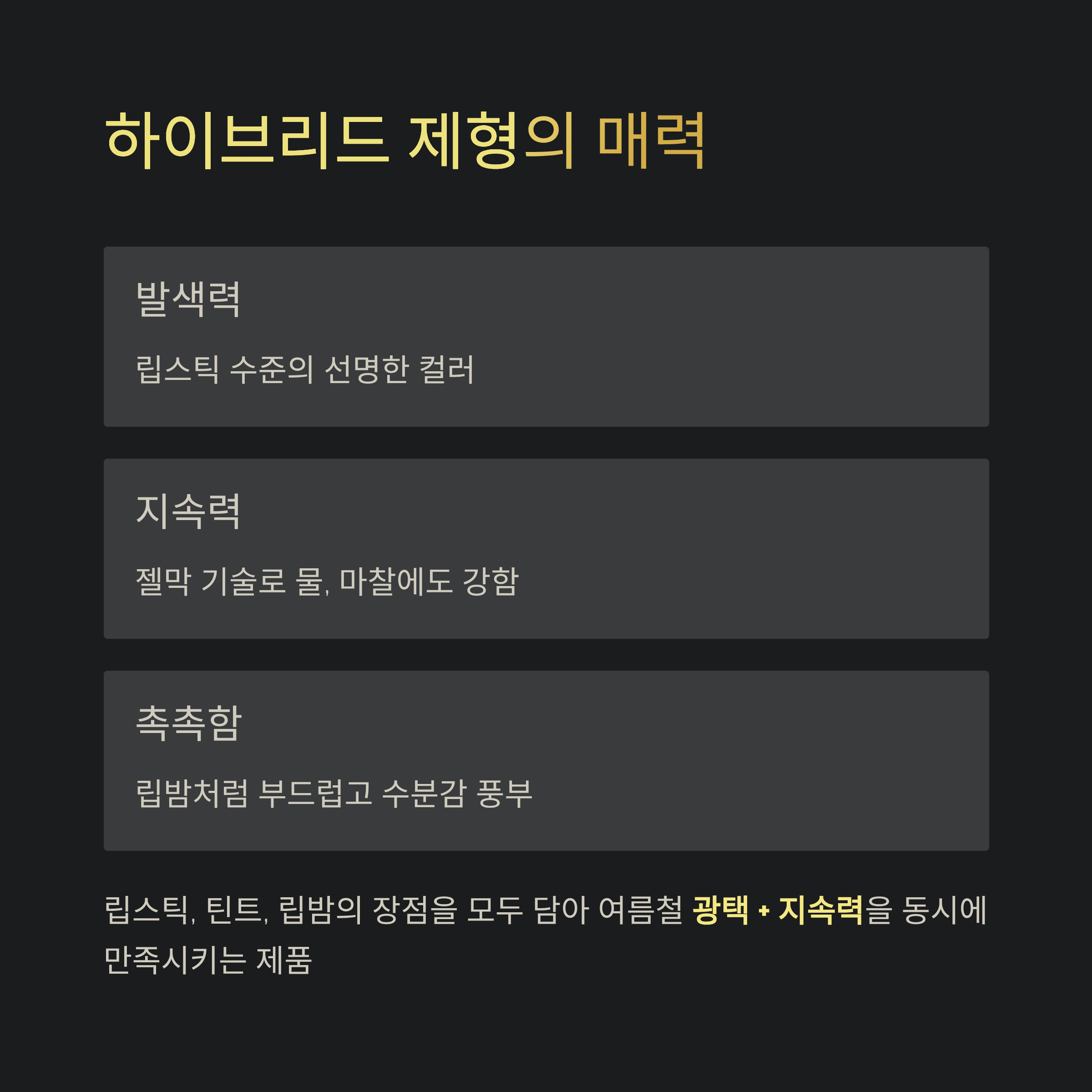 특히 여름철 립 제품에서 자주 지적되는 단점들을 보완했다는 점에서 트렌드+기능성을 모두 충족시킵니다.