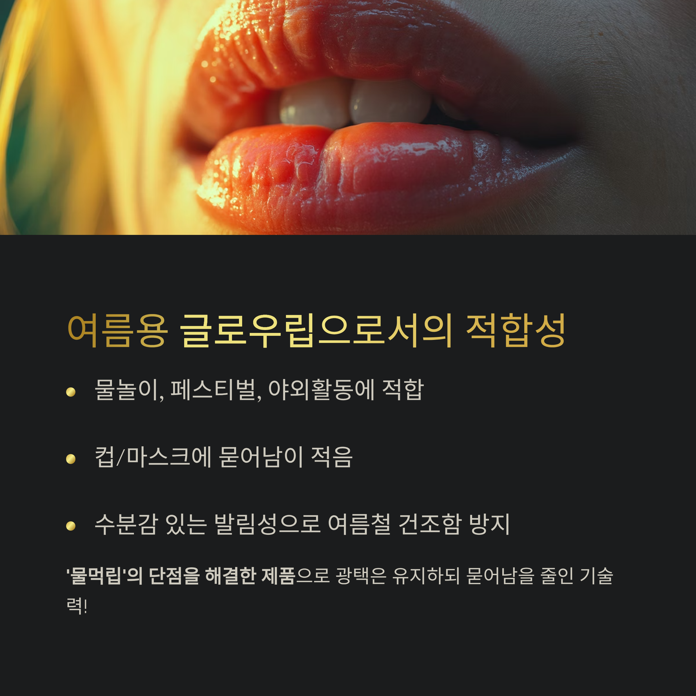 특히 여름철 ‘글로우립’을 찾는 소비자들에게 광택 + 지속력을 모두 만족시키는 제품으로 입소문을 타고 있습니다.