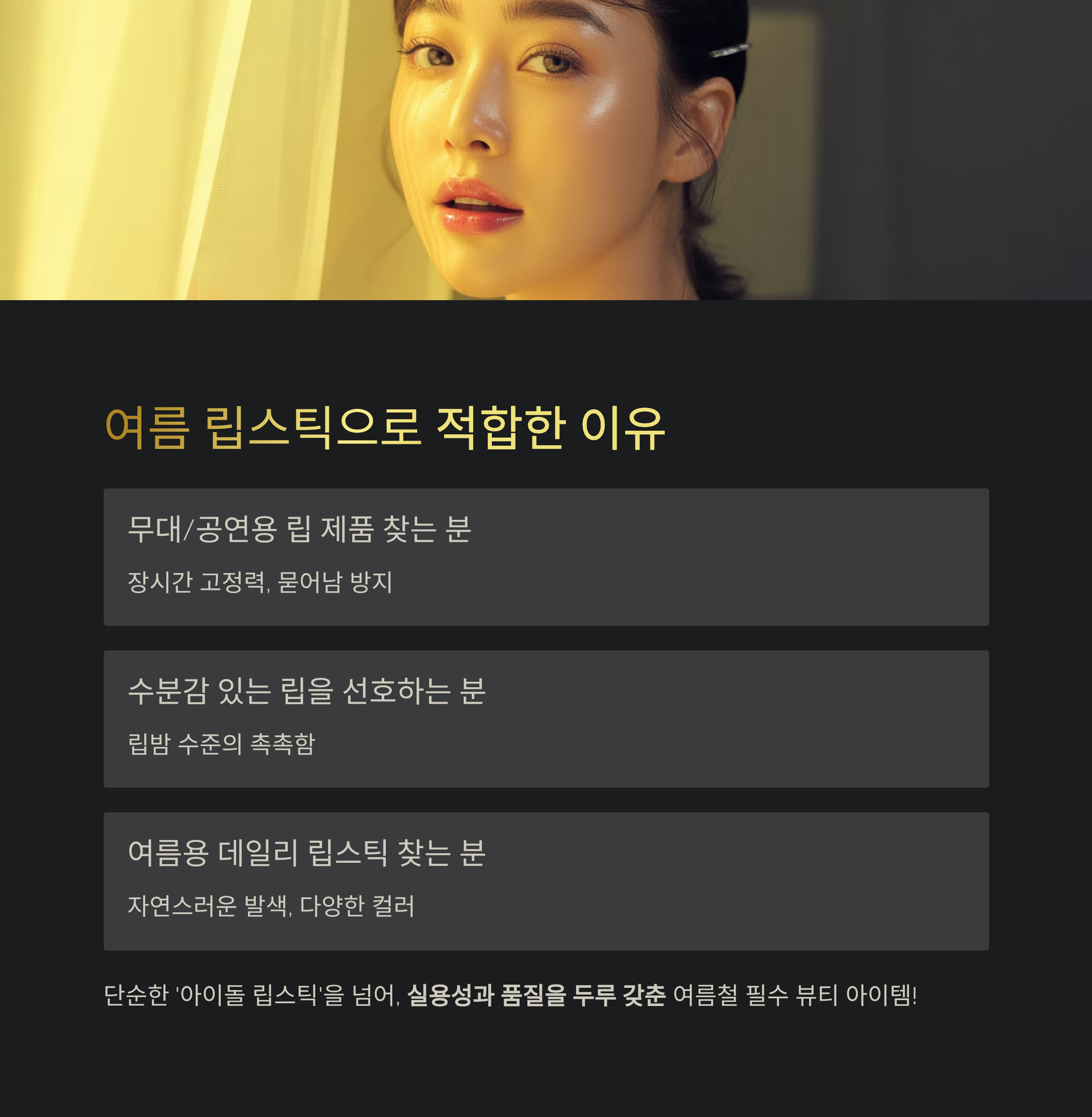 특히 여름철 립 제품에서 자주 지적되는 단점들을 보완했다는 점에서 트렌드+기능성을 모두 충족시킵니다.