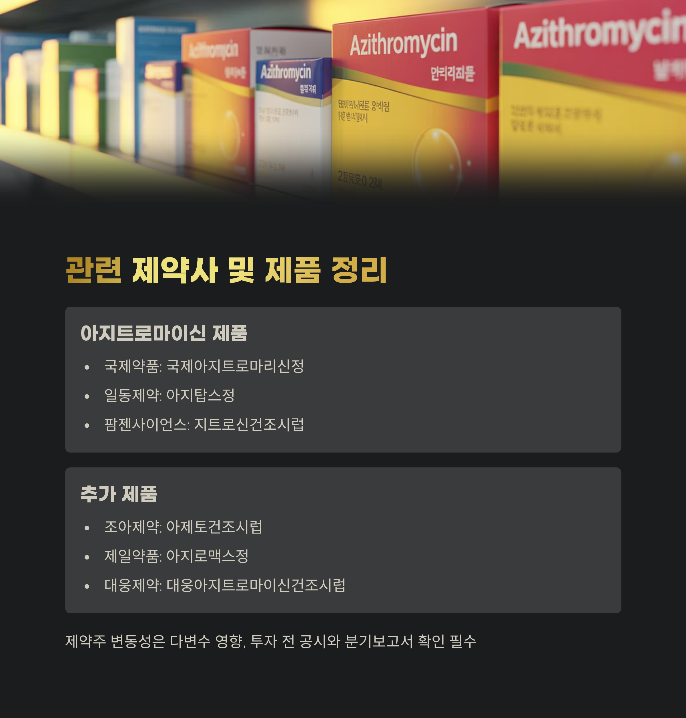 국내에서는 아지트로마이신 성분 제제를 보유한 제약사가 다수 존재합니다. 정보 출처에 따르면 다음과 같은 제품이 유통됩니다. 국제약품 국제아지트로마리신정, 일동제약 아지탑스정, 팜젠사이언스 지트로신건조시럽, 조아제약 아제토건조시럽, 제일약품 아지로맥스정, 대웅제약 대웅아지트로마이신건조시럽 등입니다. 제약주 변동성은 질환 이슈뿐 아니라 허가사항, 원가와 수급, 실적과 유통 이슈, 경쟁 품목 상황 등 다변수의 영향을 크게 받습니다. 의료정보와 투자 판단은 별개이며, 종목 선택 전 공시와 분기보고서 등 1차 자료 확인이 선행되어야 합니다.