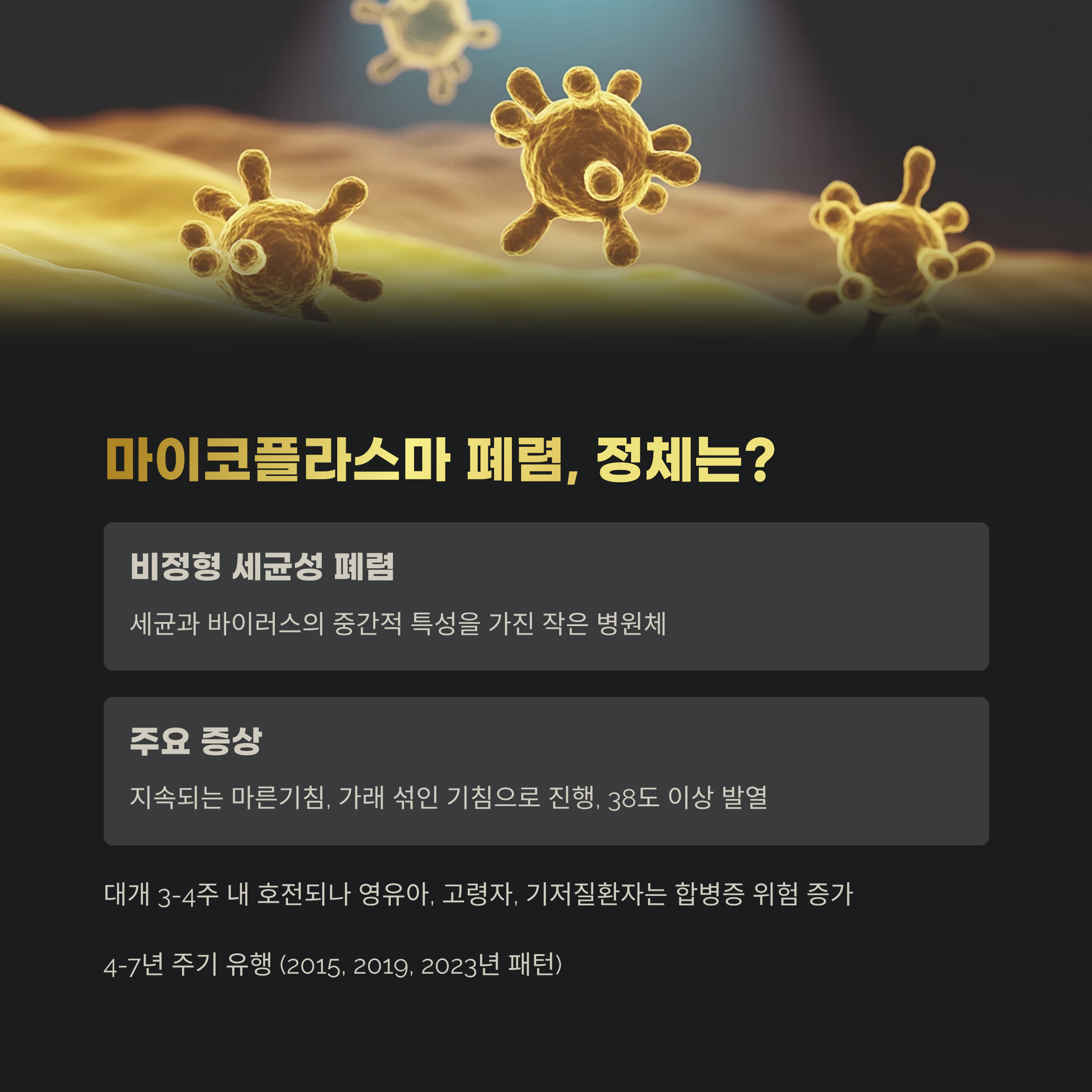 마이코플라스마는 세균과 바이러스의 중간적 특성을 보이는 작은 병원체로, 의학적으로는 비정형 세균성 폐렴 원인체로 분류됩니다. 전형적 증상은 지속되는 마른기침에서 시작해 점차 가래 섞인 기침으로 진행하고, 38도 이상의 발열이 동반될 수 있습니다. 대개 3주에서 4주 내 호전되지만, 영유아와 고령자, 기저질환이 있는 경우에는 합병증 위험이 커질 수 있습니다. 교과서적으로 4년에서 7년 주기의 유행성이 관찰되며, 2015년, 2019년, 2023년 국내외 유행 보도도 이러한 패턴과 맞물립니다.