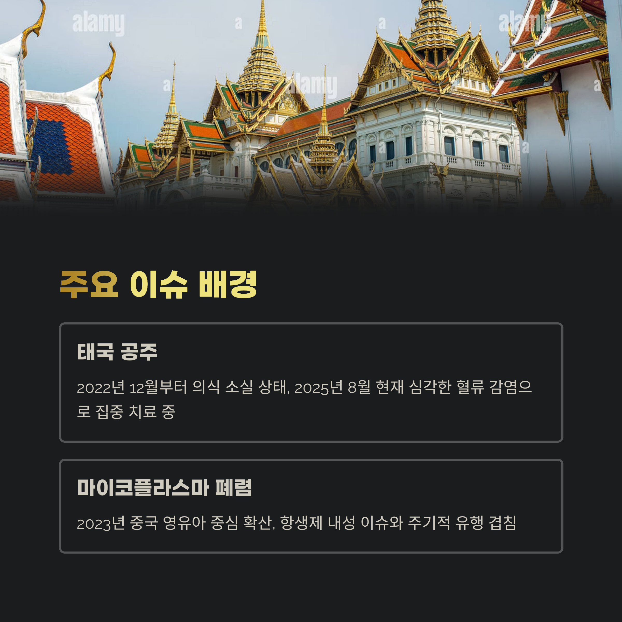 | 2025년 8월 15일 | 태국 왕실 공식 발표 | 공주 혈류 감염으로 집중 치료, 면밀 관찰 중 |