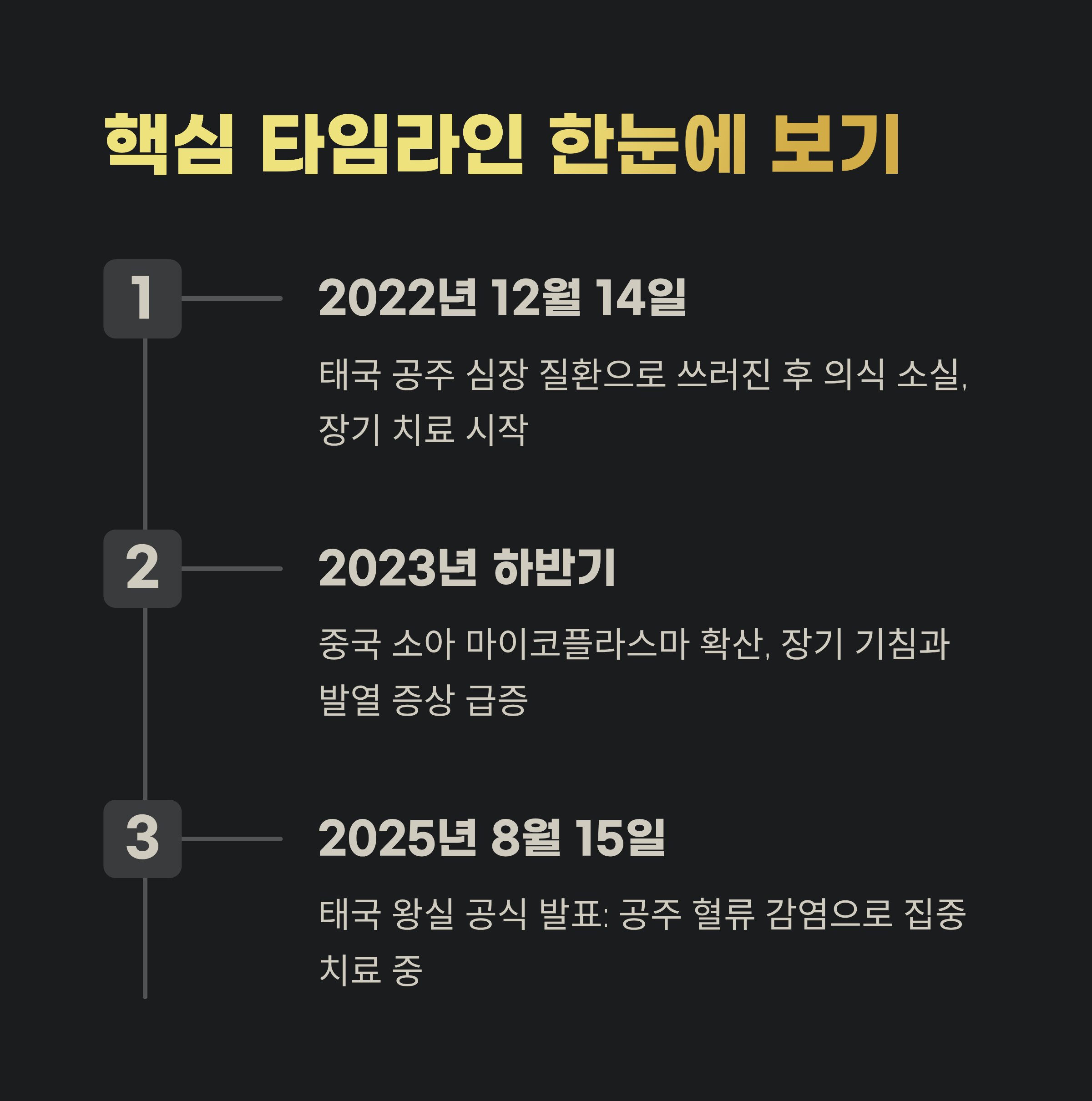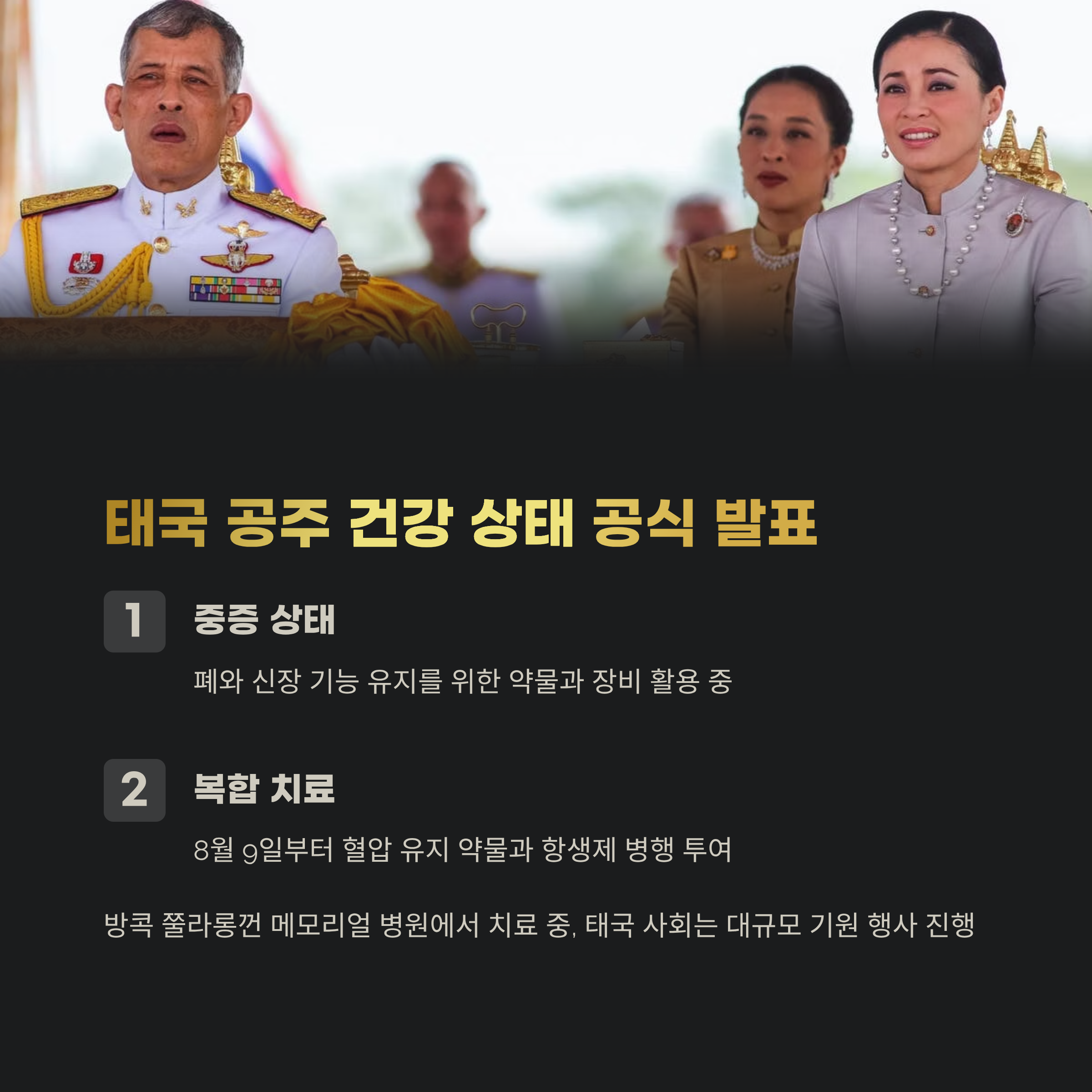 | 2025년 8월 15일 | 태국 왕실 공식 발표 | 공주 혈류 감염으로 집중 치료, 면밀 관찰 중 |