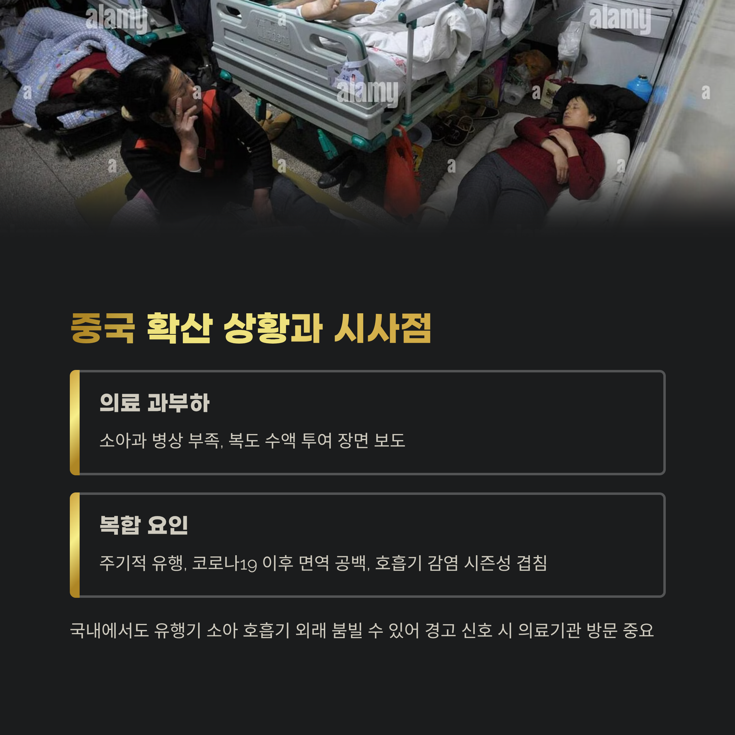 중국 일부 지역에서 소아과 병상 부족, 복도 수액 투여 장면이 보도될 정도로 환자 집중이 나타났고, 특정 항생제 품목 수요가 일시적으로 급증했습니다. 다만 마이코플라스마 자체는 새로운 병원체가 아니며, 주기적 유행과 동시에 코로나19 이후 면역 공백, 호흡기 감염 시즌성, 의료 접근성 등의 요인이 겹쳐 체감 확산을 키웠다는 해석이 나옵니다. 국내에서도 유행기에는 소아 호흡기 외래가 붐빌 수 있어 기침 지속, 고열, 호흡 곤란 등 경고 신호 시 의료기관 평가가 중요합니다.