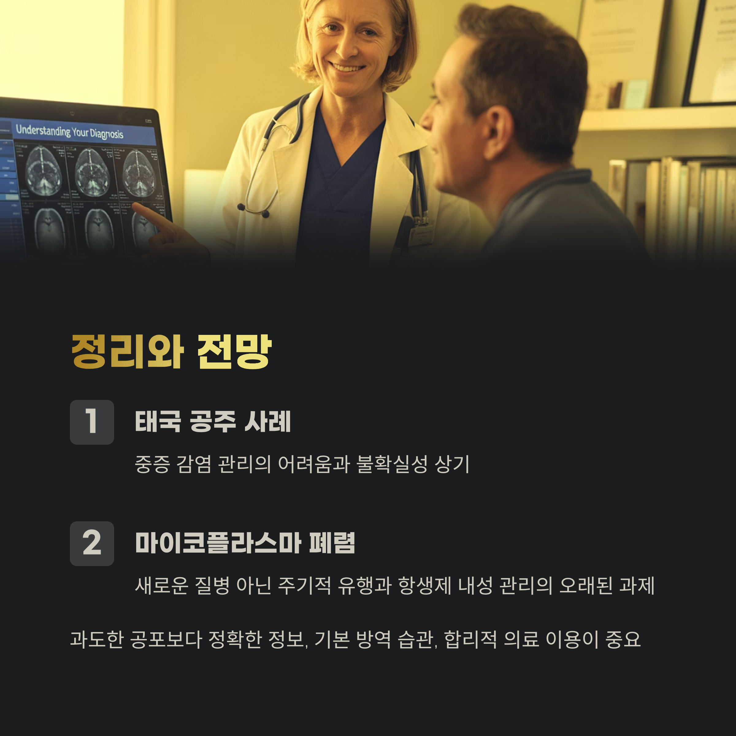 태국 공주의 건강 소식은 중증 감염 관리의 어려움과 불확실성을 상기시킵니다. 동시에 마이코플라스마 폐렴 이슈는 새로 등장한 미지의 병이 아니라, 주기적 유행성과 항생제 내성 관리라는 오래된 과제를 다시 조명하게 했습니다. 과도한 공포보다 정확한 정보와 기본 방역 습관, 합리적 의료 이용이 중요합니다. 제약 섹터의 단기 변동에 휩쓸리기보다, 데이터와 본질적 펀더멘털을 함께 보는 태도가 길게 도움이 됩니다.