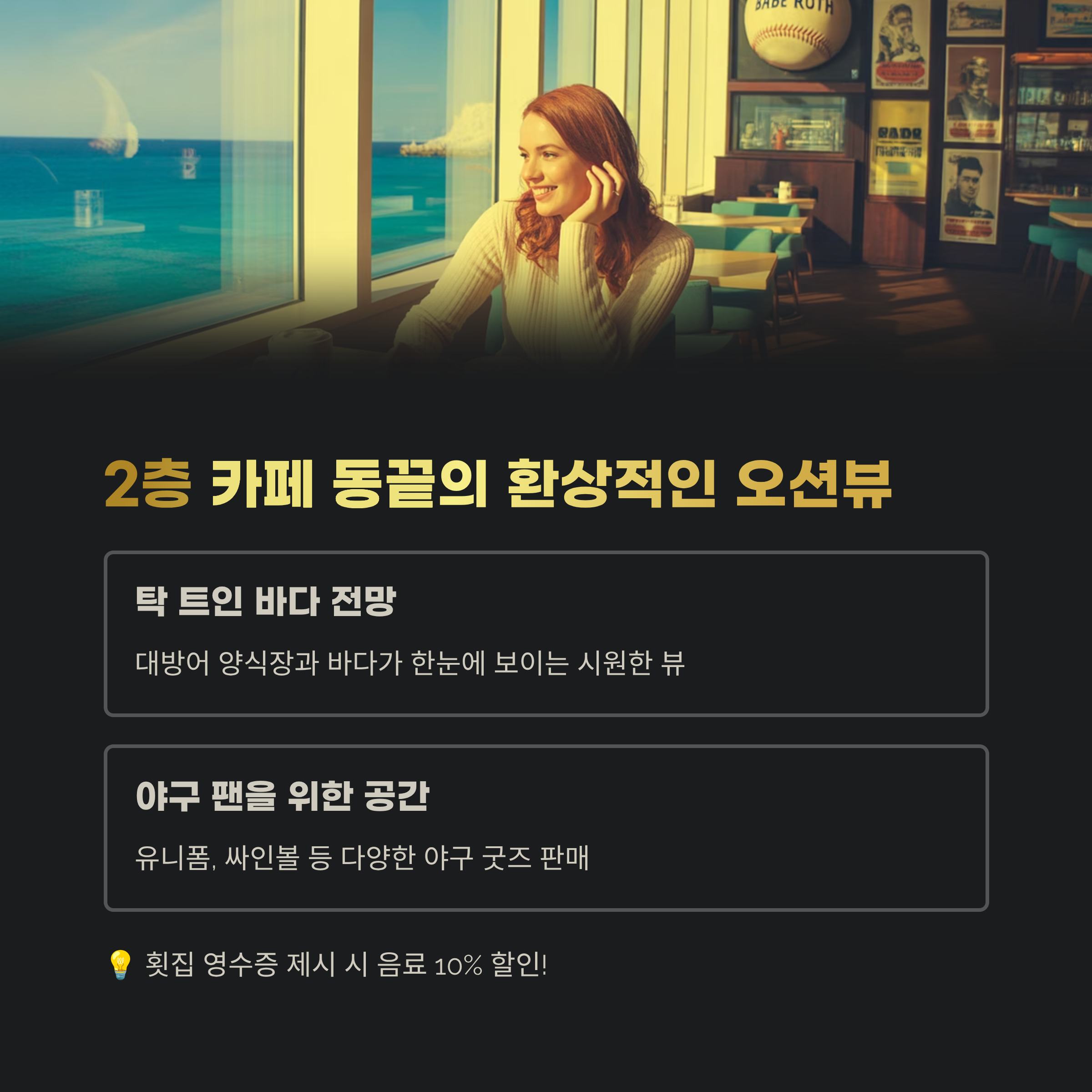 | 할인 혜택 | 횟집 영수증 제시 시 카페 10% 할인 |